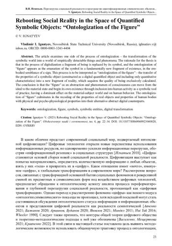 Рассмотрена одна из сторон становления новой социальной реальности – преобразование цифрового символического мира в мир эмпирически обнаруживаемых явлений и процессов. Обоснован тезис, что при цифровизации происходит не только замена фрагментов бытия его символами, но и преобразование самих символов в новые фрагменты бытия, в воплощенные подобия знака. Этот процесс предложено интерпретировать как «онтологизацию цифры» – перенос свойств символического объекта, сконструированного как цифровой квантифицированный объект и включающего только количественные характеристики, в новый фрагмент реальности, приобретающий качество быть исключительно вычисляемым. Сделан вывод, что «цифра» как абстракция и феномен сознания может переходить из идеального в материальное состояние и начинать собственное существование через включение в человеческую деятельность в качестве символического инструмента практики, оказывая конструктивистское воздействие на вещественно-предметный мир и на поведение человека. Онтологизация цифры завершается перекодировкой характеристик социальных процессов и реальных предметов, физических и психофизиологических свойств человеческих тел в их альтернативные абстрактные цифровые аналоги