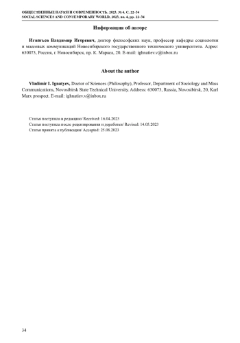 12. Игнатьев В.И. (2018) Социальные структуры в информационном резонансе: перспектива трансдисциплинарной методологии // Общественные науки и современность. № 2. С. 166-176. EDN: WYHJTE