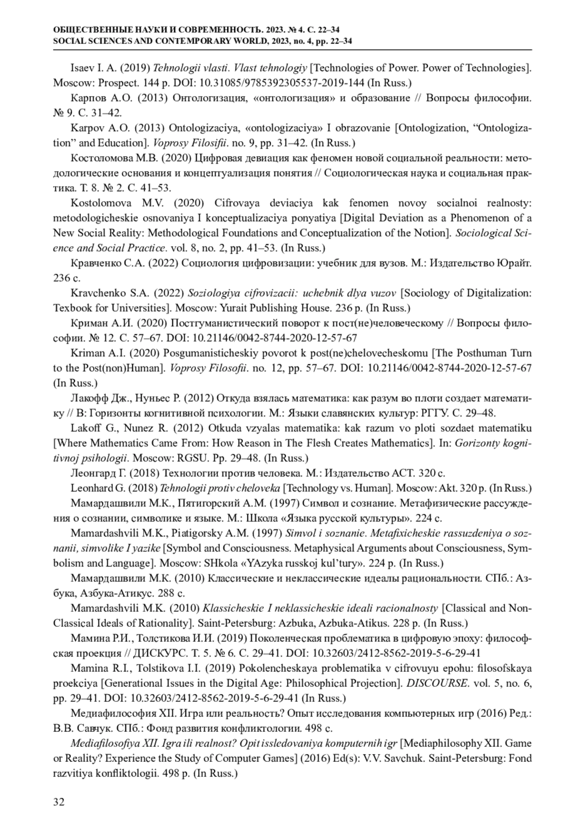 22. Мамина Р.И., Толстикова И.И. (2019) Поколенческая проблематика в цифровую эпоху: философская проекция // ДИСКУРС. Т. 5. № 6. С. 29-41. DOI: 10.32603/2412-8562-2019-5-6-29-41 EDN: HAFIQS