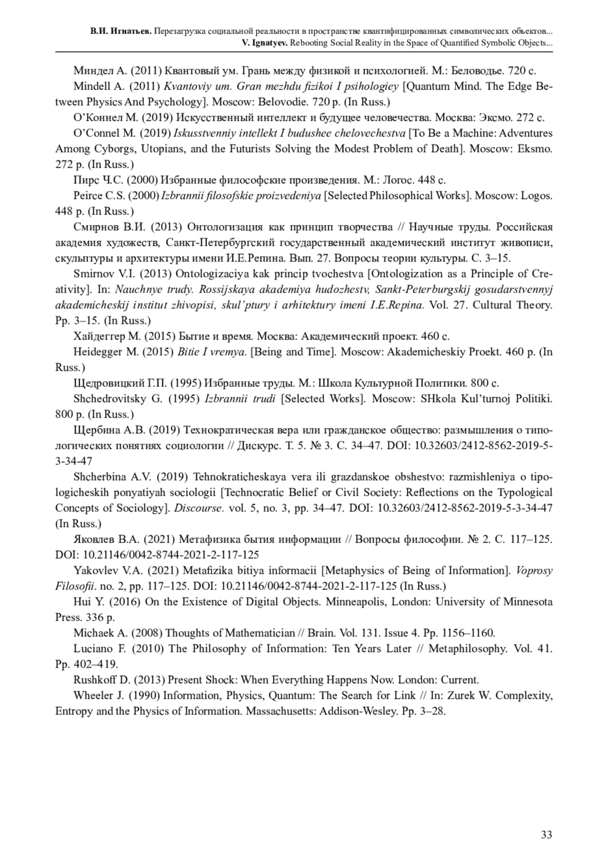 33. Яковлев В.А. (2021) Метафизика бытия информации // Вопросы философии. № 2. С. 117-125. DOI: 10.21146/0042-8744-2021-2-117-125 EDN: YRQQQY