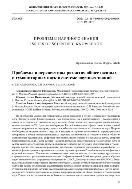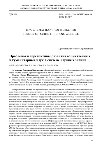 На протяжении многих лет гуманитарные науки находятся в «тени» естественно-технических наук. Значимую долю финансирования – как бюджетного, так и внебюджетного – распределяют в пользу естественных и технических наук, на долю общественных и гуманитарных дисциплин приходится лишь около 5%. Грантовая поддержка от Российского научного фонда также в значительной степени направлена на поддержку проектов в области естественных и технических наук. Назрела необходимость модернизировать подходы к поддержке научных исследований: перераспределить приоритеты в пользу междисциплинарных научных исследований на «стыке» научных областей (когнитивные исследования, цифровые технологии, науки о жизни и социальные науки, цифровая гуманитаристика и др.). Цель работы – выявить проблемы общественных и гуманитарных наук на основе комплексного анализа данных в области естественно-технических, общественных и гуманитарных наук по следующим направлениям: внутренние затраты на исследования и разработки, источники финансирования, грантовая поддержка научных проектов Российским научным фондом и кадровый потенциал. Применены экономико-статистические методы, а также методы группировки и сравнительного ретроспективного анализа. Информационной базой выступили данные Организации экономического сотрудничества и развития (ОЭСР), Института статистики ЮНЕСКО, Федеральной службы государственной статистики (Росстат), а также отчеты Российского научного фонда (РНФ). На основе объективных аналитических выводов о необходимости активизировать поддержку междисциплинарных научных исследований в рамках государственных программ научно-технологического развития предложены основные направления развития общественных и гуманитарных наук. Результаты исследования могут быть использованы представителями органов государственной власти Российской Федерации при разработке программных документов научно-технологической политики государства