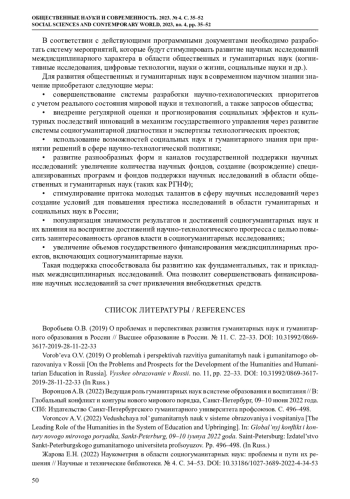 1. Воробьева О.В. (2019) О проблемах и перспективах развития гуманитарных наук и гуманитарного образования в России // Высшее образование в России. № 11. С. 22-33. DOI: 10.31992/0869-3617-2019-28-11-22-33 EDN: WEKDXB