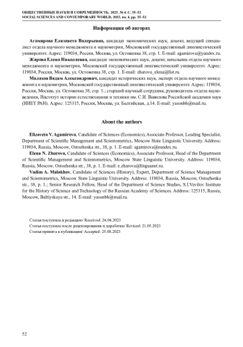 3. Жарова Е.Н. (2022) Наукометрия в области социогуманитарных наук: проблемы и пути их решения // Научные и технические библиотеки. № 4. С. 34-53. DOI: 10.33186/1027-3689-2022-4-34-53 EDN: ZKOYAA