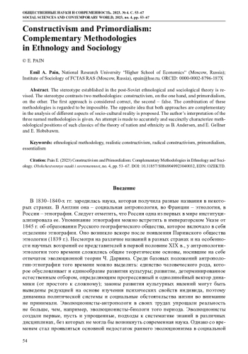 Проведена ревизия стереотипа, устоявшегося в постсоветской этнологической и социологической теории. Он противопоставляет две методологии: конструктивизм и примордиадизм. Первый подход принято считать верным, второй – ложным, сочетать же данные методологии в рамках этого стереотипа недопустимо. Выдвинута противоположная идея о том, что оба подхода взаимно дополняют друг друга, что позволяет анализировать разные стороны социально-культурной реальности. Дана авторская трактовка методологий, в связи с чем предпринята попытка переосмыслить методологические позиции классиков теории нации: Б. Андерсена, Э. Геллнера и Э. Хобсбаума