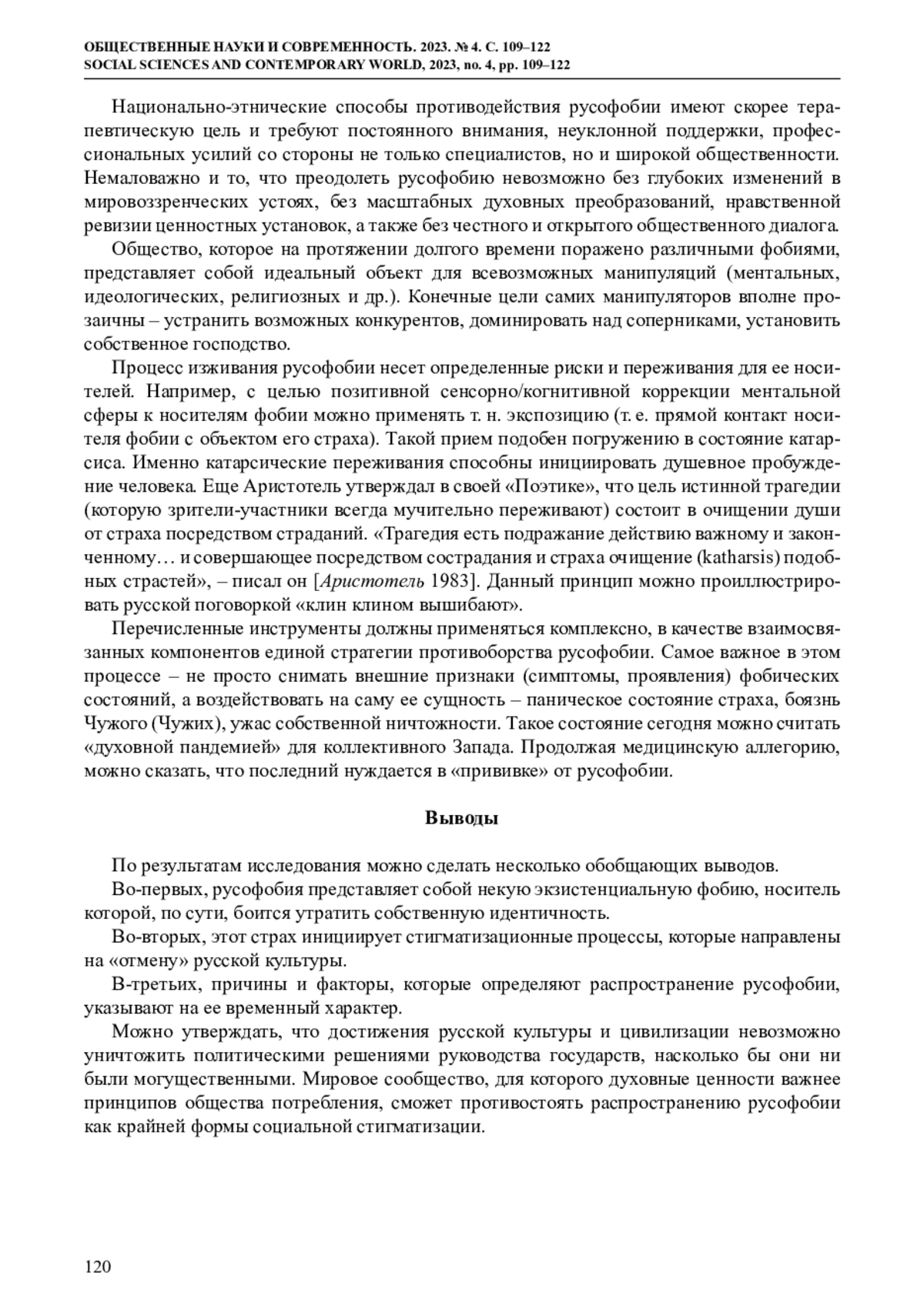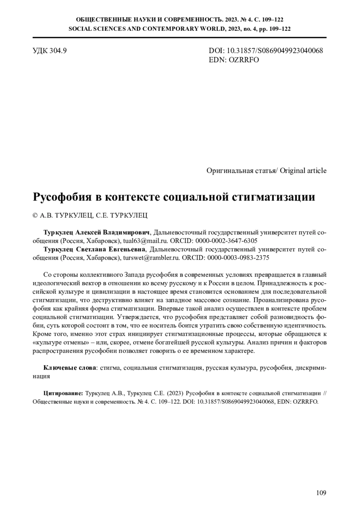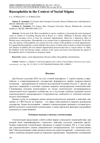 Со стороны коллективного Запада русофобия в современных условиях превращается в главный идеологический вектор в отношении ко всему русскому и к России в целом. Принадлежность к российской культуре и цивилизации в настоящее время становится основанием для последовательной стигматизации, что деструктивно влияет на западное массовое сознание. Проанализирована русофобия как крайняя форма стигматизации. Впервые такой анализ осуществлен в контексте проблем социальной стигматизации. Утверждается, что русофобия представляет собой разновидность фобии, суть которой состоит в том, что ее носитель боится утратить свою собственную идентичность. Кроме того, именно этот страх инициирует стигматизационные процессы, которые обращаются к «культуре отмены» – или, скорее, отмене богатейшей русской культуры. Анализ причин и факторов распространения русофобии позволяет говорить о ее временном характере
