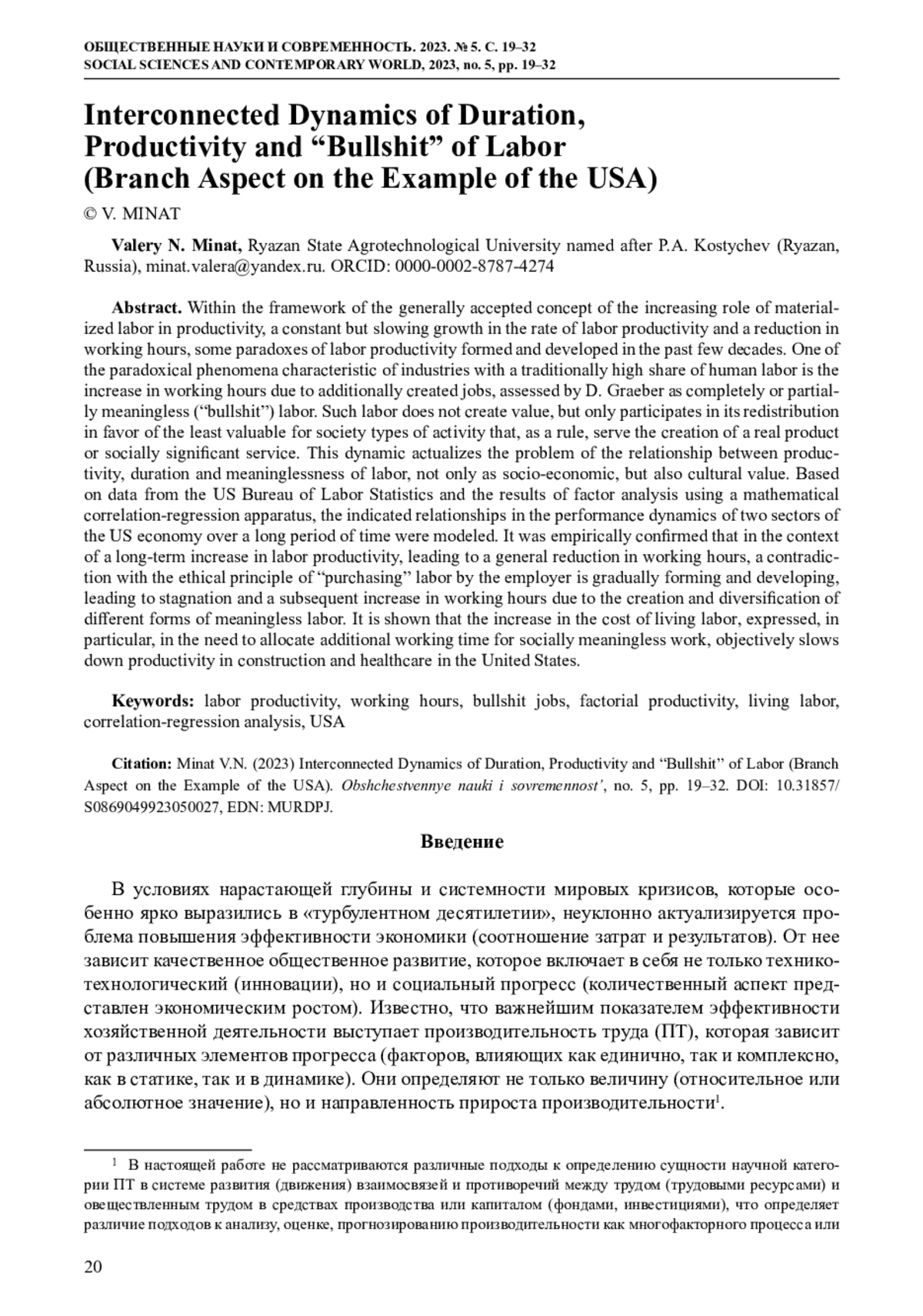 Ценностная составляющая труда повышает роль проблемы взаимосвязи таких важнейших его характеристик, как производительность, продолжительность и «бессмысленность». Все они представляют собой не только социально-экономические, но и культурологические категории. Проведено моделирование взаимосвязей между этими характеристиками в динамике производительности двух отраслей американской экономики за длительный период времени. Применены приемы факторного анализа, который использует математический корреляционно-регрессионный аппарат, в сочетании с познанием структурных особенностей значения живого труда. Эмпирически подтверждена гипотеза о том, что в условиях долгосрочного повышения производительности труда, из-за которого сокращается продолжительность рабочего времени, постепенно формируется и развивается противоречие с этическим принципом «покупки» труда работодателем. Данная тенденция способствует стагнации и последующему увеличению рабочего времени за счет создания и диверсификации разных форм «бессмысленного труда». Показано, что рост затрат живого труда, выраженный, в частности, в выделении дополнительного рабочего времени на общественно бессмысленные работы, объективно замедляет производительность в строительстве и здравоохранении США