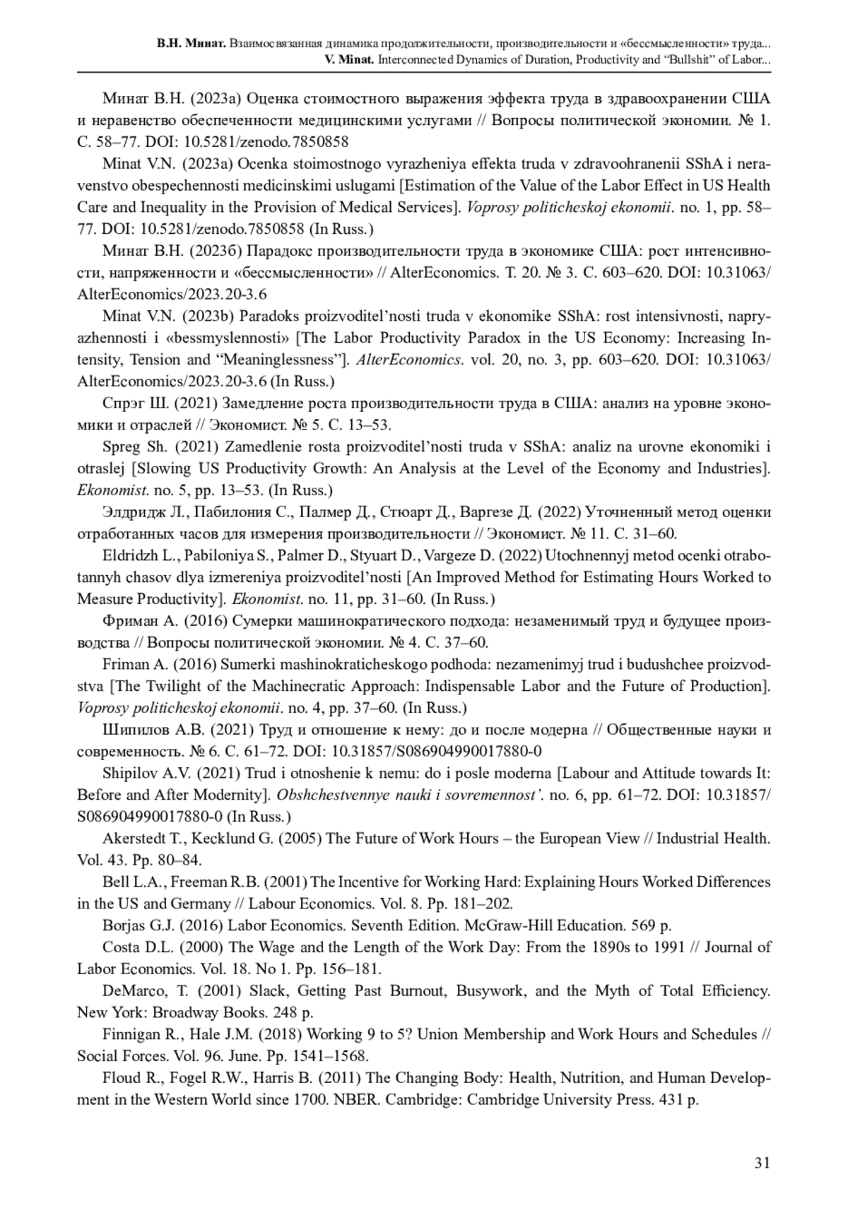 14. Минат В.Н. (2023б) Парадокс производительности труда в экономике США: рост интенсивности, напряженности и “бессмысленности” // AlterEconomics. Т. 20. № 3. С. 603-620. DOI: 10.31063/AlterEconomics/2023.20-3.6 EDN: EAQZAD