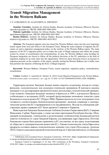 Европейский миграционный кризис превратил государства Западных Балкан в важнейший транзитный регион из стран Азии и Африки в государства Европейского союза. Именно ЕС как основной реципиент переселенцев проводит активную политику по управлению миграцией на территории стран западнобалканского региона. Главной целью политики руководства ЕС становится снижение масштабов нелегальных переселений и реформирование системы предоставления убежища за счет ее секьюритизации и экстернализации. В свою очередь государства Западных Балкан, взяв курс на евроинтеграцию, вынуждены следовать всем политическим решениям властей ЕС. Однако данные решения приводят к увеличению миграционного давления на страны региона, фактически превращая Западные Балканы в буферную зону, которая выполняет функцию фильтрации нелегальных мигрантов