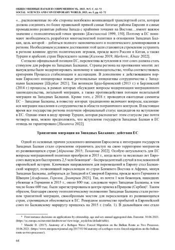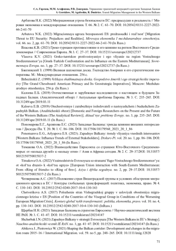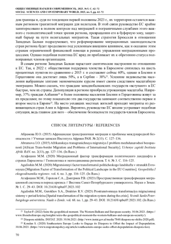 12. Abikova J., Piotrowicz W. (2021) Shaping the Balkan corridor: Development and changes in the migration route 2015-16 // International Migration. vol. 59. no 5, рp. 248-265. DOI: 10.1111/imig.12828 EDN: DCZWMF