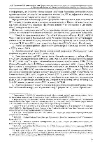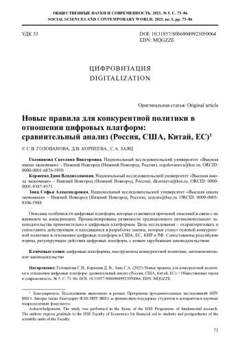Описаны особенности цифровых платформ, которые становятся причиной опасений в связи с их влиянием на конкуренцию. Проанализированы уязвимости традиционного антимонопольного законодательства применительно к цифровым платформам. Цель исследования – охарактеризовать и сопоставить действующие и находящиеся в разработке законы, которые станут основой конкурентной политики в отношении цифровых платформ в США, ЕС, КНР и РФ. Сопоставлены российские нормы, регулирующие действия цифровых платформ, с новым зарубежным законодательством