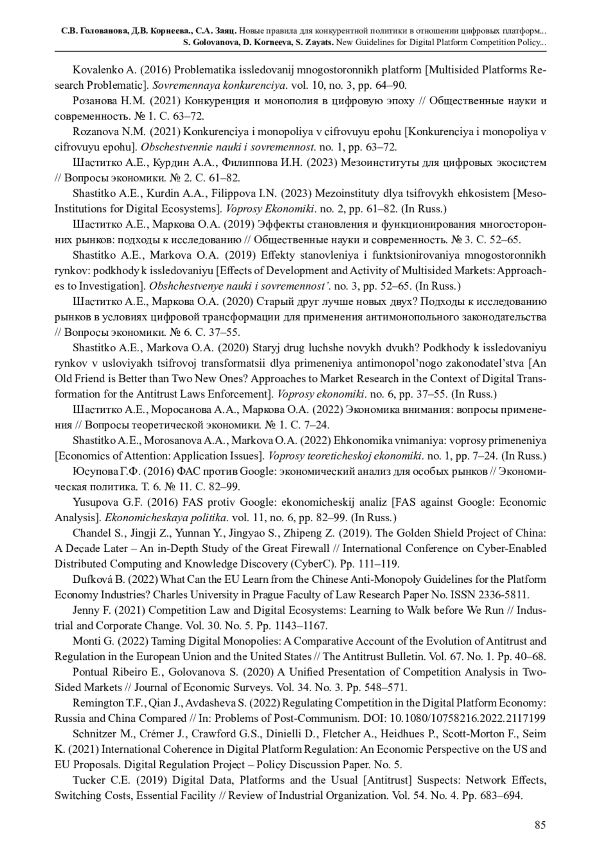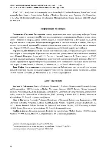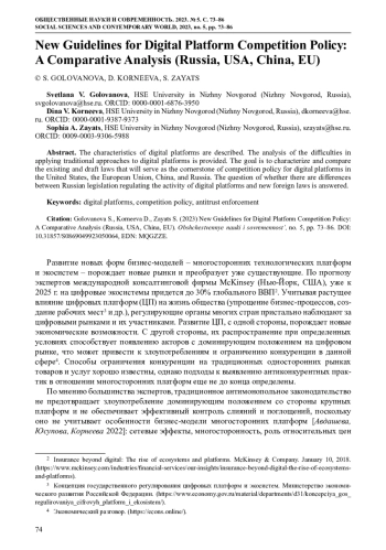 17. Remington T.F., Qian J., Avdasheva S. (2022) Regulating Competition in the Digital Platform Economy: Russia and China Compared // In: Problems of Post-Communism. DOI: 10.1080/10758216.2022.2117199