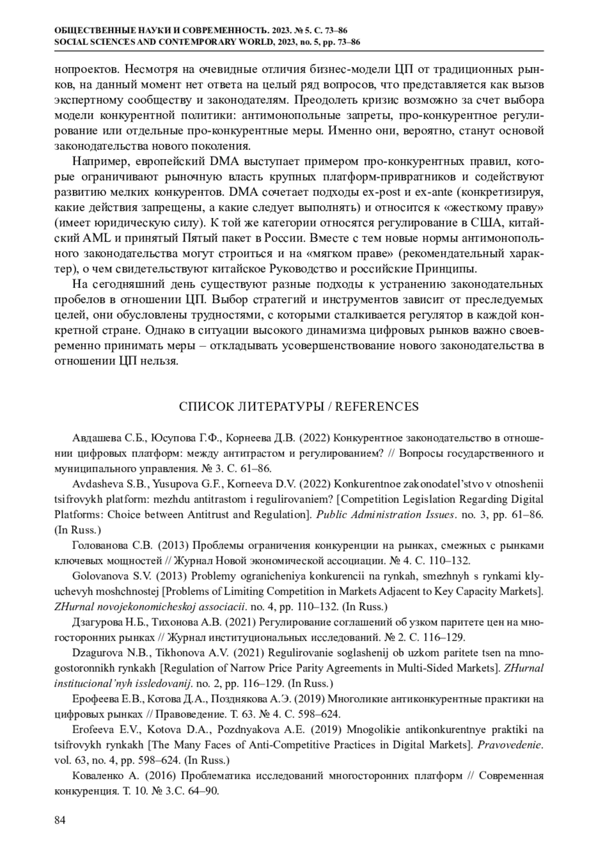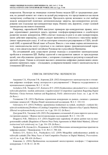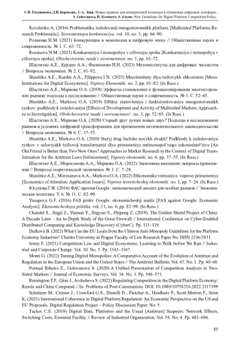 1. Авдашева С.Б., Юсупова Г.Ф., Корнеева Д.В. (2022) Конкурентное законодательство в отношении цифровых платформ: между антитрастом и регулированием? // Вопросы государственного и муниципального управления. № 3. С. 61-86. EDN: OMQMTP