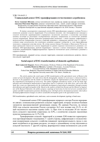 В статье анализируется социальный аспект ESG-трансформации аграрного сектора России в контексте развития сельских территорий. В исследовании показано, что демографическая ситуация в сельской местности характеризуется сокращением численности населения и количества населенных пунктов, несмотря на реализацию государственных программ, направленных на комплексное развитие сельских территорий. Авторы выделяют противоречивые тенденции: с одной стороны, цифровизация и технологическая модернизация сельского хозяйства приводят к сокращению рабочей силы, а с другой - создают новые возможности для устойчивого развития аграрных сообществ за счет диверсификации экономики и повышения качества жизни. На основе анализа данных Росстата и Минсельхоза России авторы предлагают типологию сельских территорий по уровню социально-экономического развития и потенциалу ESG-трансформации, выделяя территории с высоким и низким потенциалом развития, что позволяет разрабатывать дифференцированные стратегии достижения целей устойчивого развития в аграрном секторе.