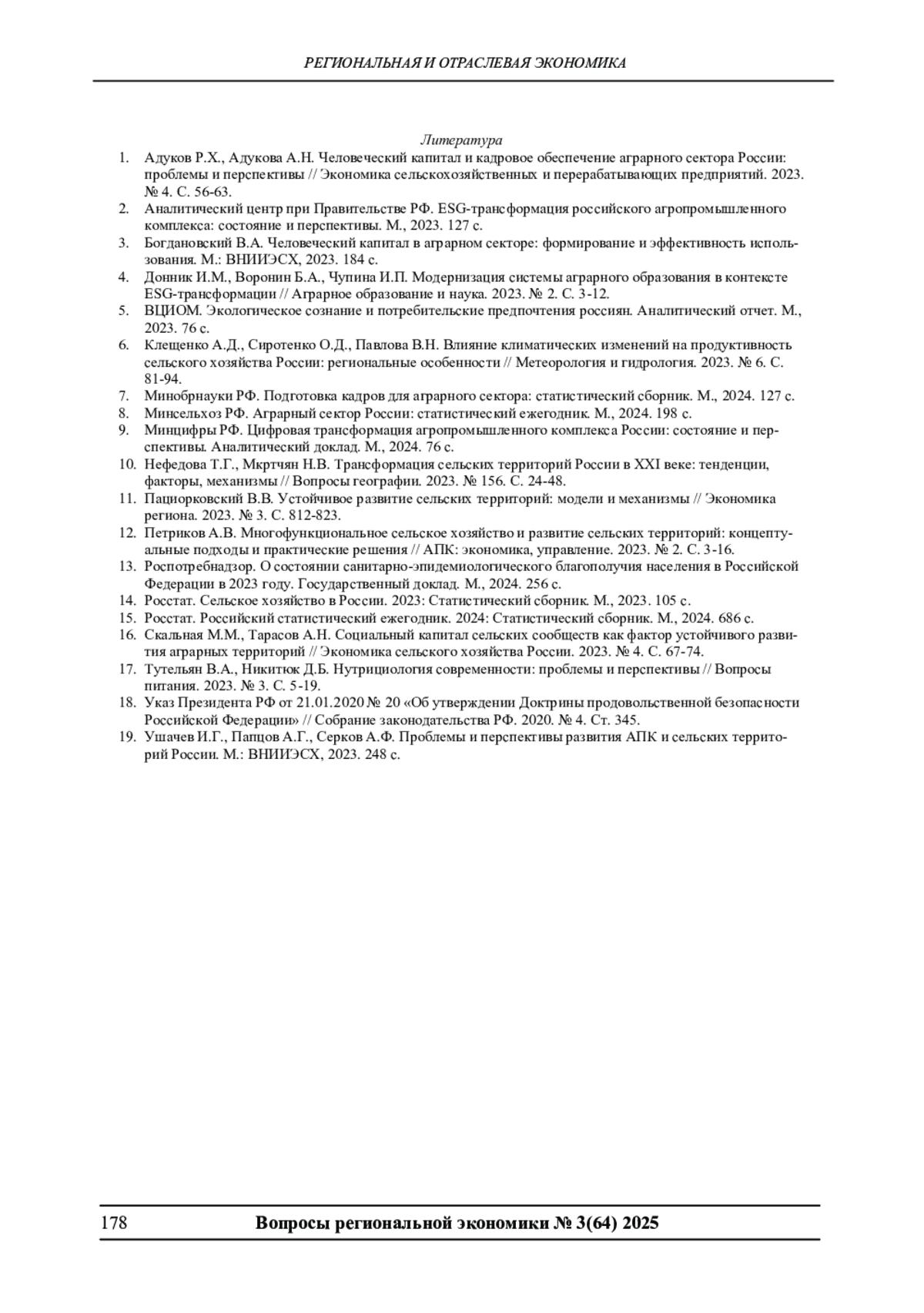 19. Ушачев И.Г., Папцов А.Г., Серков А.Ф. Проблемы и перспективы развития АПК и сельских территорий России. М.: ВНИИЭСХ, 2023. 248 с.