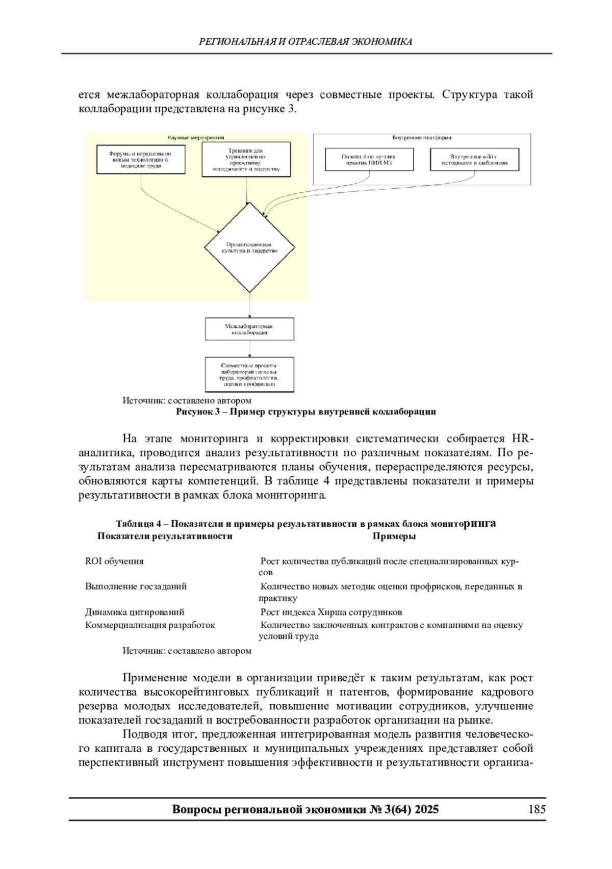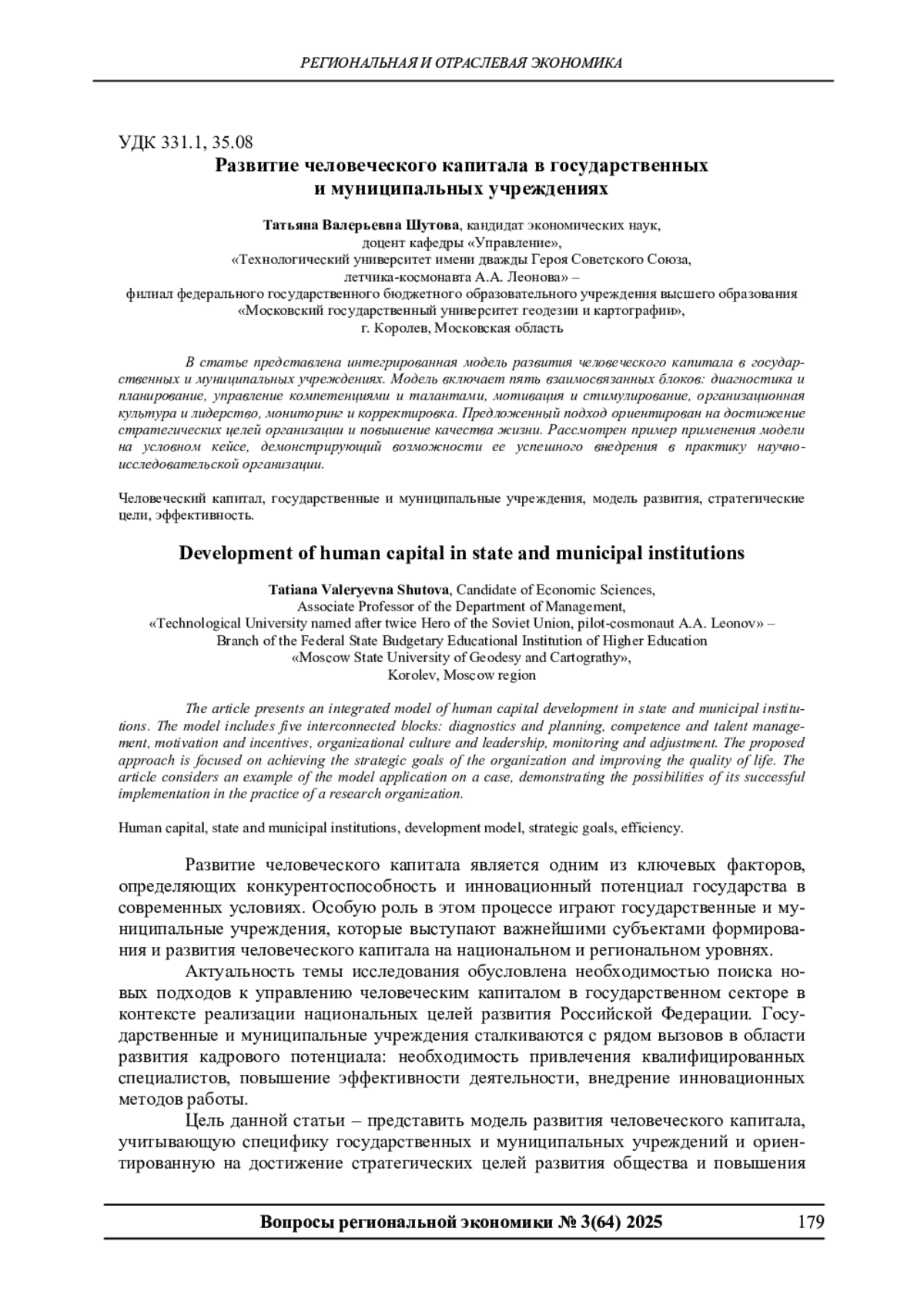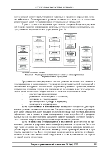 В статье представлена интегрированная модель развития человеческого капитала в государственных и муниципальных учреждениях. Модель включает пять взаимосвязанных блоков: диагностика и планирование, управление компетенциями и талантами, мотивация и стимулирование, организационная культура и лидерство, мониторинг и корректировка. Предложенный подход ориентирован на достижение стратегических целей организации и повышение качества жизни. Рассмотрен пример применения модели на условном кейсе, демонстрирующий возможности ее успешного внедрения в практику научно-исследовательской организации.