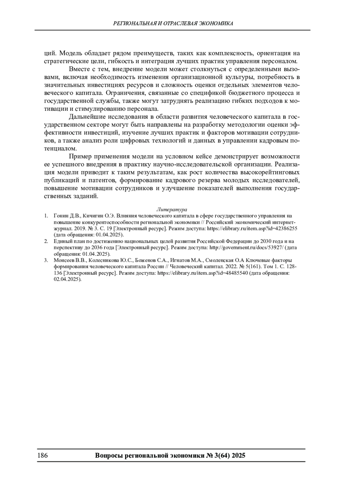 1. Гонин Д.В., Кичигин О.Э. Влияния человеческого капитала в сфере государственного управления на повышение конкурентоспособности региональной экономики // Российский экономический интернет-журнал. 2019. № 3. С. 19 [Электронный ресурс]. Режим доступа: item.asp?id=42386255 (дата обращения: 01.04.2025). EDN: BBPZZF