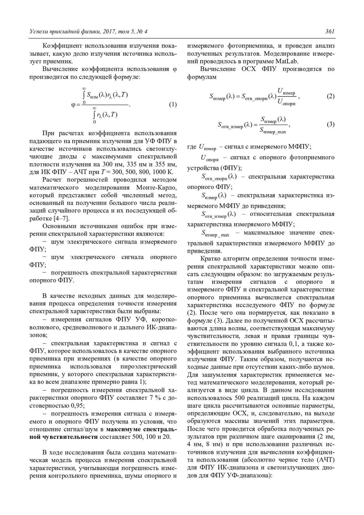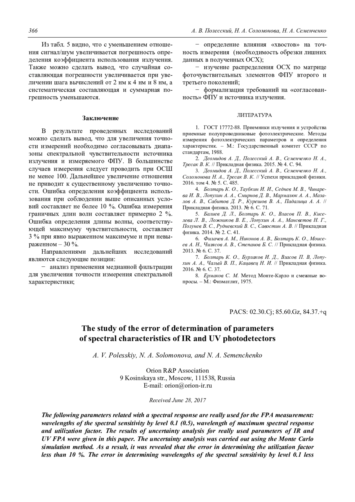 Полесский А. В., Соломонова Н. А., Семенченко Н. А. Исследование погрешности определения параметров спектральной характеристики ИК и УФ фотоприемных устройств 360