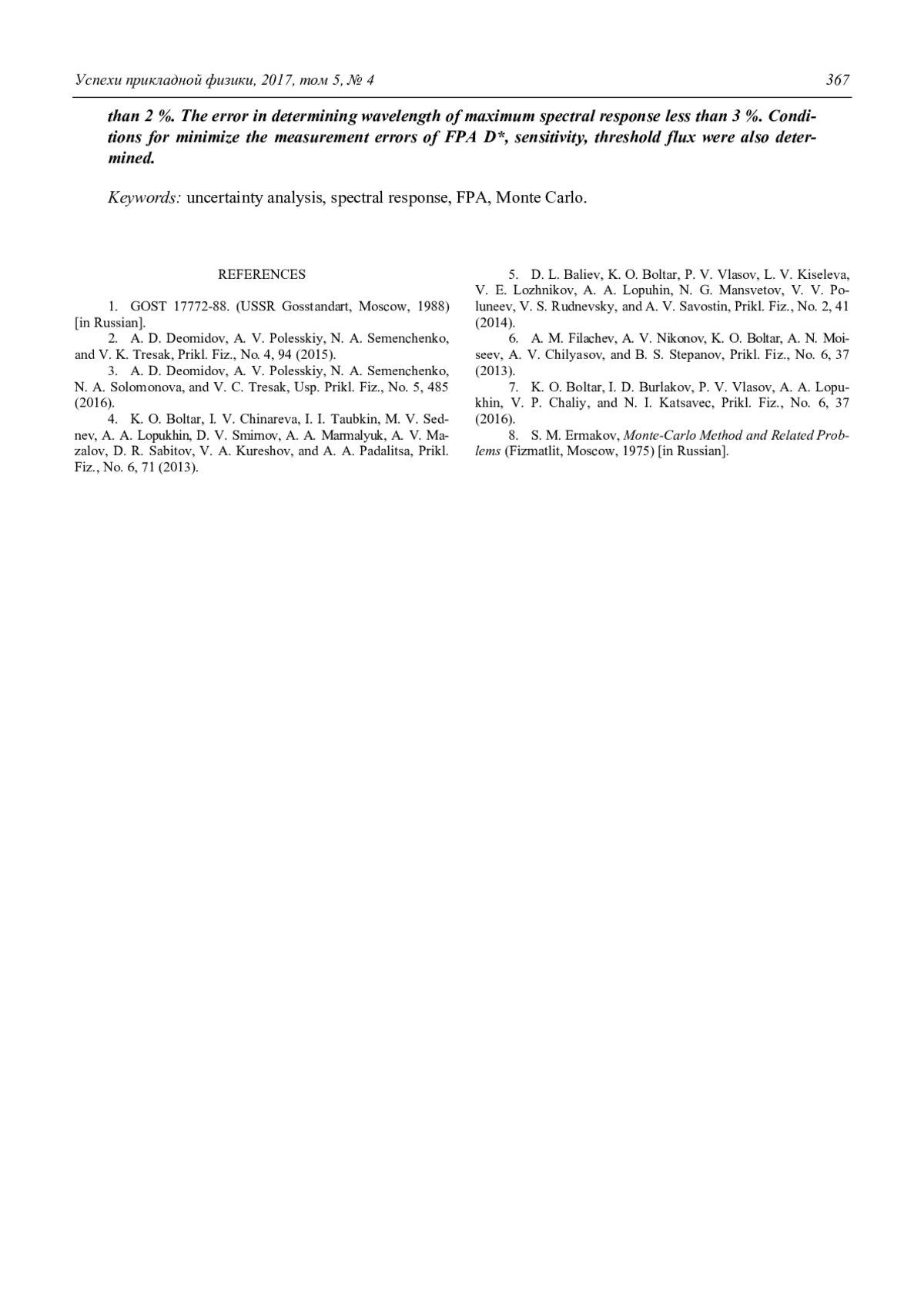 5. Балиев Д. Л., Болтарь К. О., Власов П. В., Киселева Л. В., Ложников В. Е., Лопухин А. А., Мансветов Н. Г., Полунев В. С., Рудневский В. С., Савостин А. В. // Прикладная физика. 2014. № 2. С. 41.