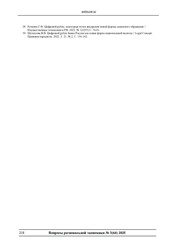 24. Костылева Е.А., Семенов С.В., Дубровина Л.В. Цифровой рубль как средства стабилизации финансовой системы // Региональные проблемы преобразования экономики. 2020. № 12. С. 26-37.