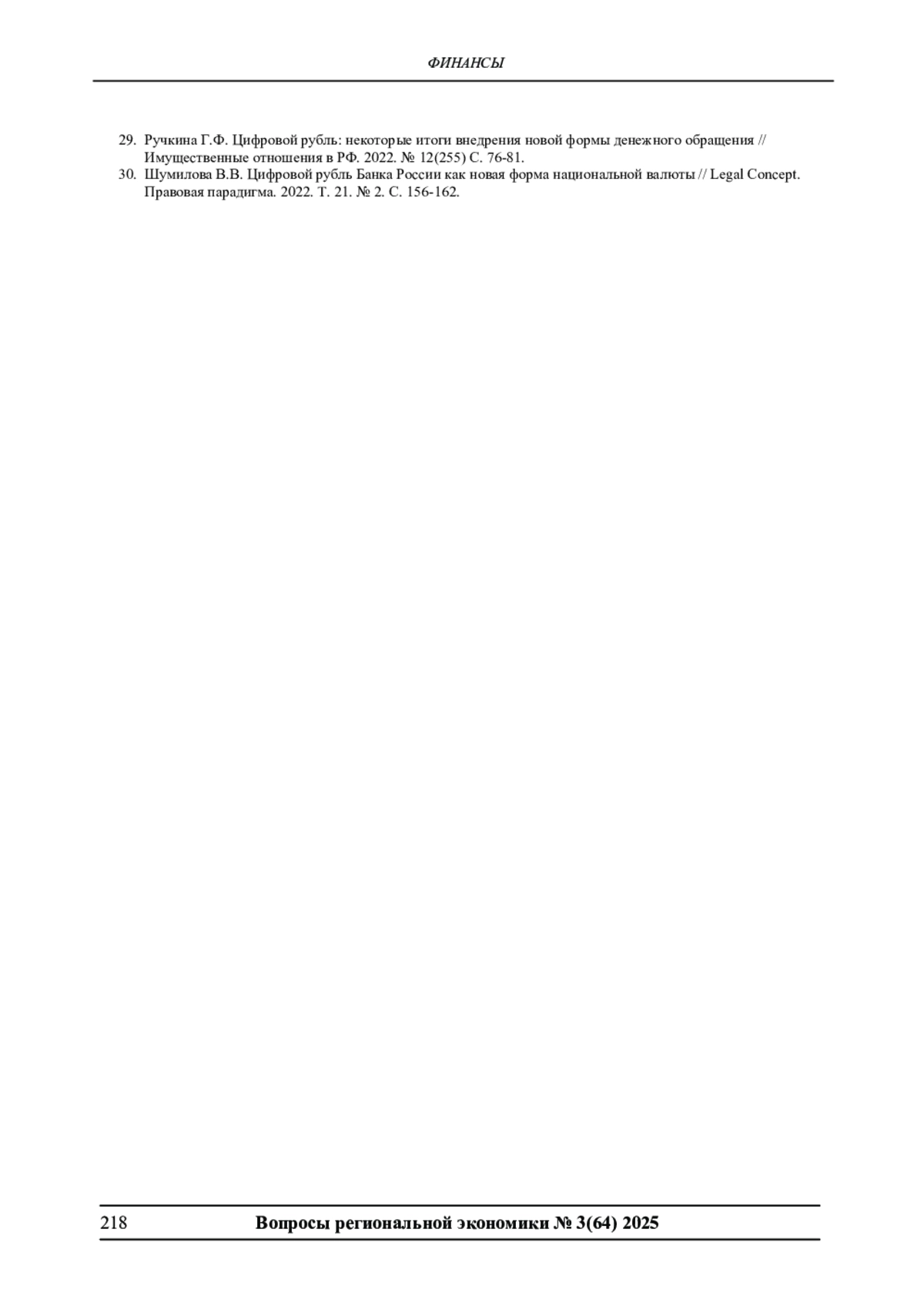 30. Шумилова В.В. Цифровой рубль Банка России как новая форма национальной валюты // Legal Concept. Правовая парадигма. 2022. Т. 21. № 2. С. 156-162.