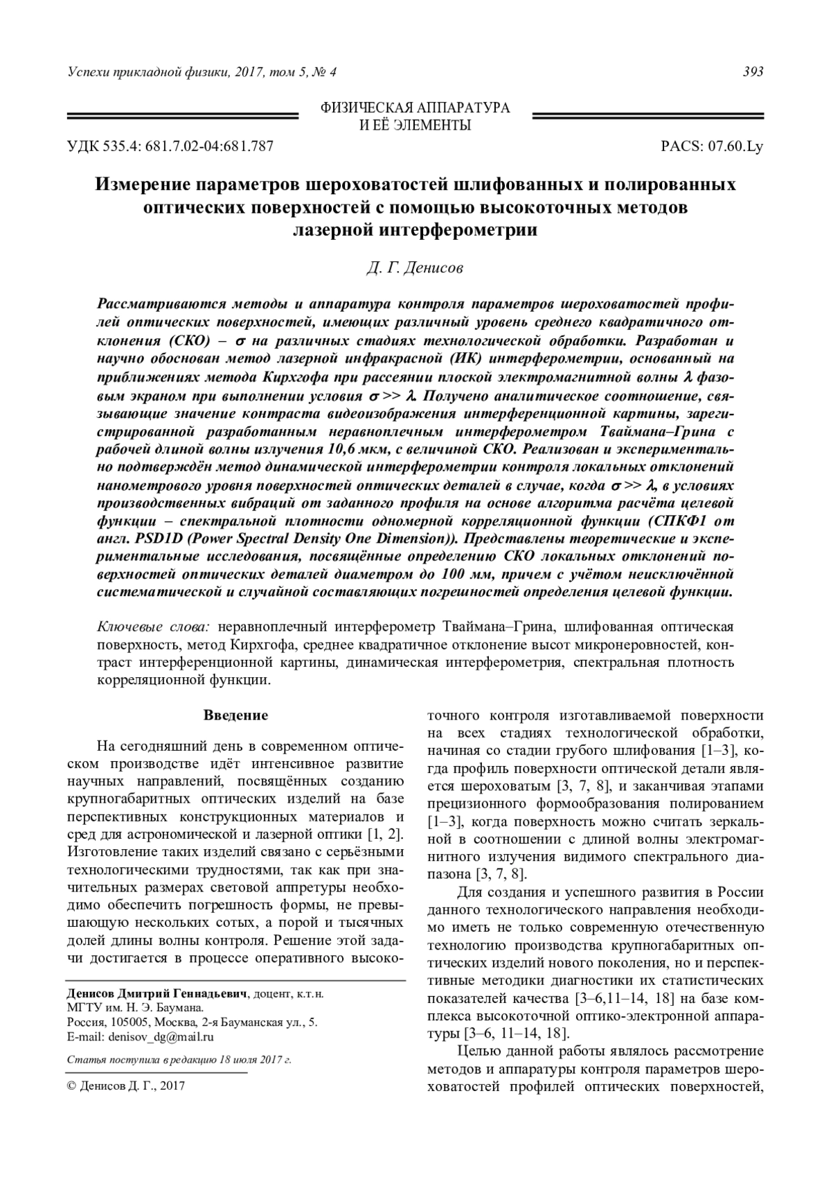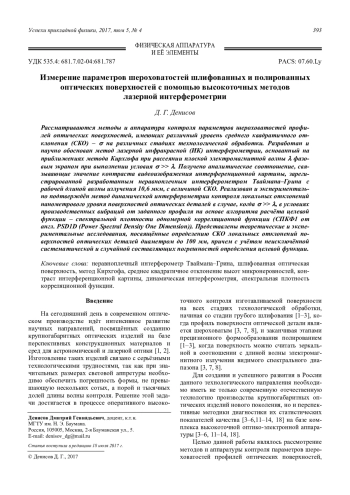 Денисов Д. Г. Измерение параметров шероховатостей шлифованных и полированных оптических поверхностей с помощью высокоточных методов лазерной интерферометрии 393