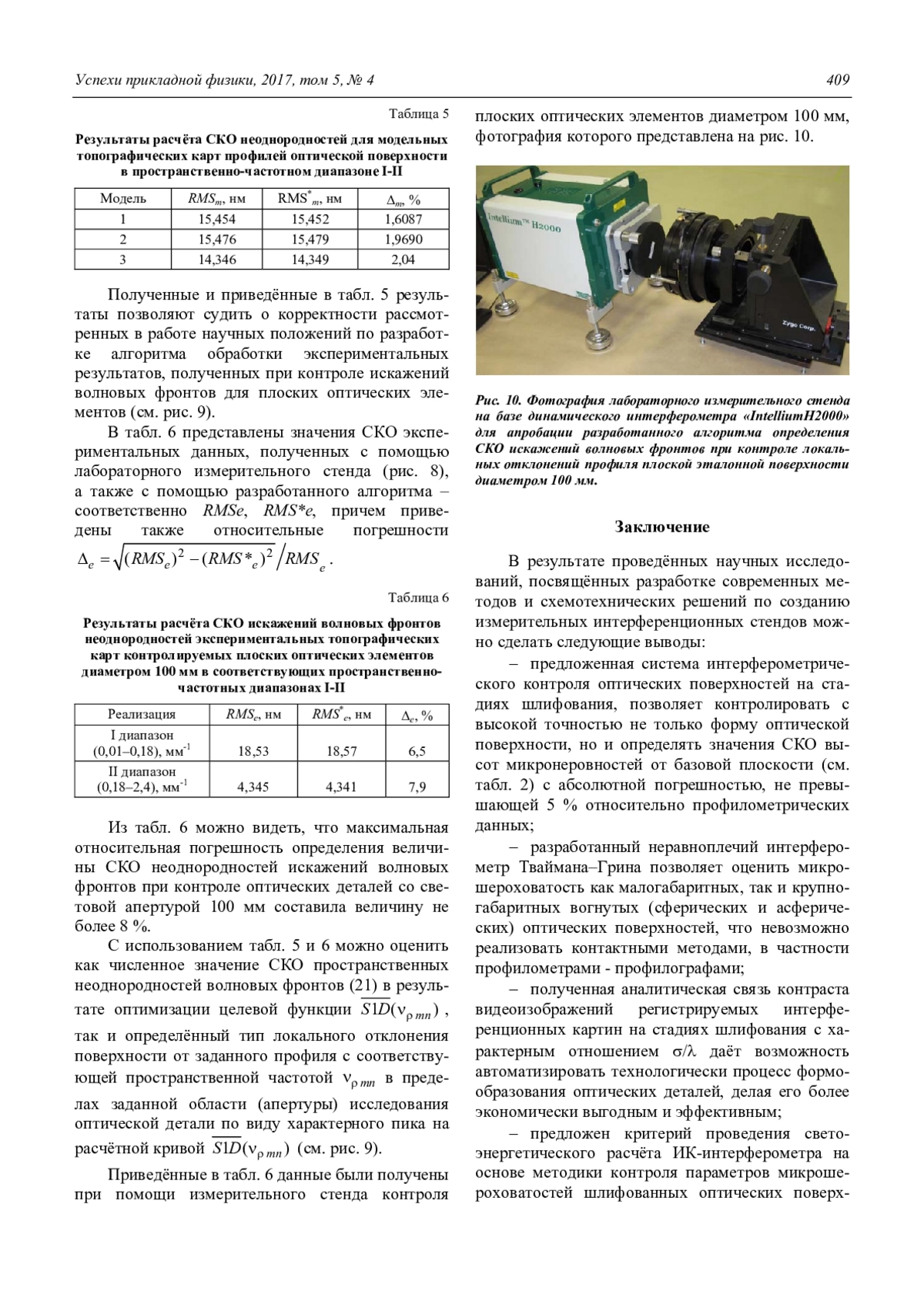 разработанный метод динамической интерферометрии контроля неоднородностей искажений волновых фронтов для плоских оптических элементов, позволил в лабораторных и производственных условиях с высокой точностью определять наличие и размер неоднородностей в частотных диапазонах I, II (см. табл. 4), для которых максимальная относительная погрешность определения величины СКО составила величину не более 8 %.