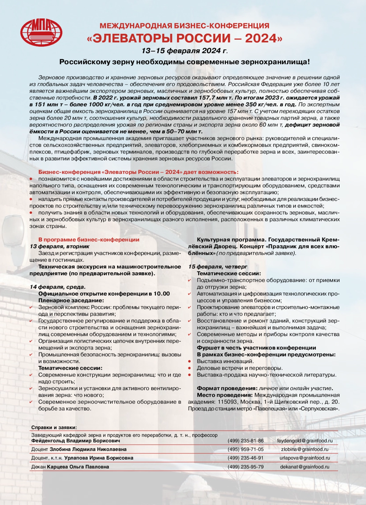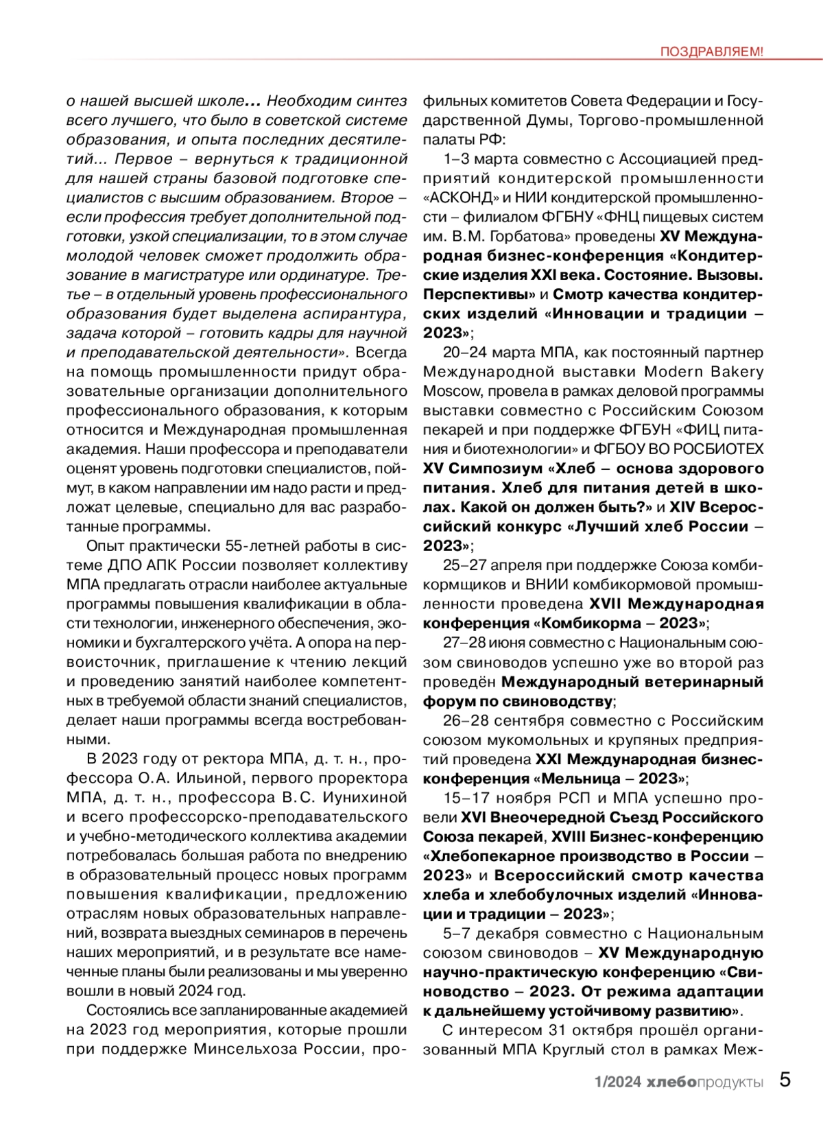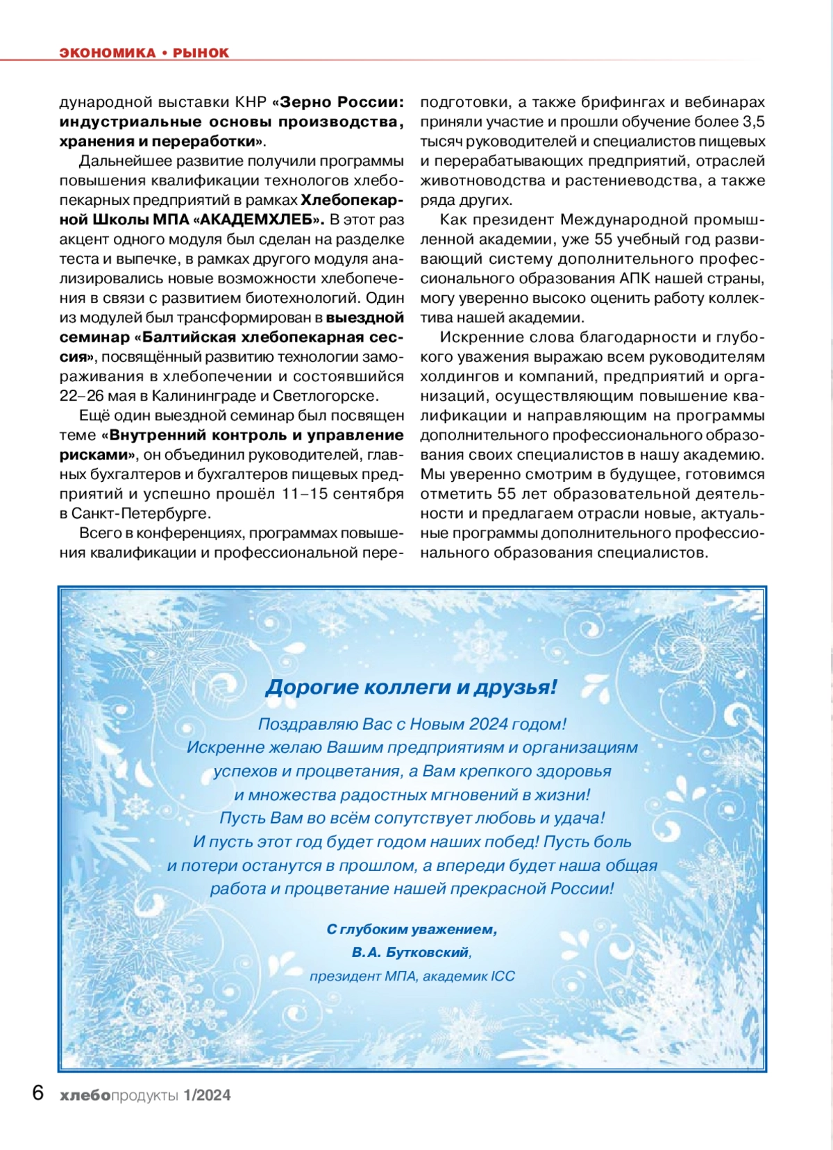 Отгремели новогодние праздники. Мы простились с ушедшим 2023 годом и встретили новый 2024 год. Каким он будет? Конечно, хочется верить в лучшее. А значит, мы все ждём сокращения санкций многих стран в отношении России, дальнейшего развития экономики нашей страны, роста доходов предприятий, специалисты которых проходят повышение квалификации и профессиональную переподготовку в Международной промышленной академии (МПА). А это большинство пищевых и перерабатывающих отраслей АПК и многие отрасли сельского хозяйства, в первую очередь животноводства.
