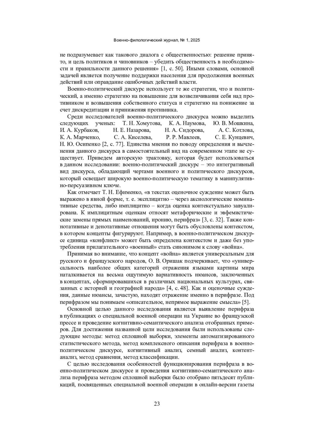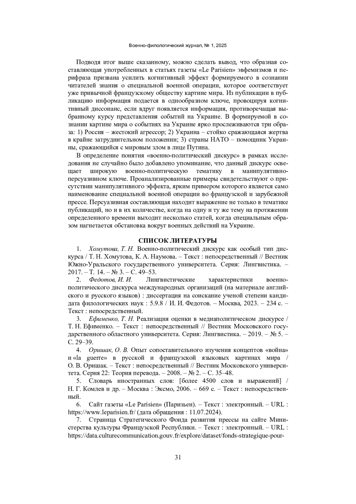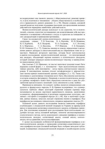 1. Хомутова, Т. Н. Военно-политический дискурс как особый тип дискурса / Т. Н. Хомутова, К. А. Наумова. - Текст: непосредственный // Вестник Южно-Уральского государственного университета. Серия: Лингвистика. - 2017. - Т. 14. - № 3. - С. 49-53. EDN: ZEZCPX