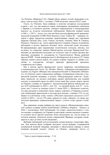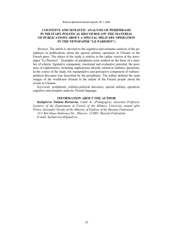 Статья посвящена когнитивно-семантическому анализу перифраза в публикациях о специальной военной операции на Украине во французской прессе. Объектом исследования стали статьи в онлайн-версии газеты «Le Parisien». Примеры перифраза изучались на основе ряда критериев: образная составляющая, эмоционально-оценочный потенциал, присутствие эвфемизмов, в том числе эвфемизмов, непосредственно связанных с военными действиями. В ходе исследования была описана манипулятивно-персуазивная составляющая военно-политического дискурса, нашедшая свое отражение в перифразе, были выделены основные образы картины мира, формируемой в сознании французского народа о событиях на Украине.