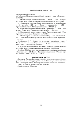15. Белая, Е.Н. Некоторые черты концепта смерти во французской языковой картине мира / Е. Н. Белая. - Текст: непосредственный // Омский научный вестник. - 2013. - № 1 (115). - С. 88-92. EDN: QILEFP