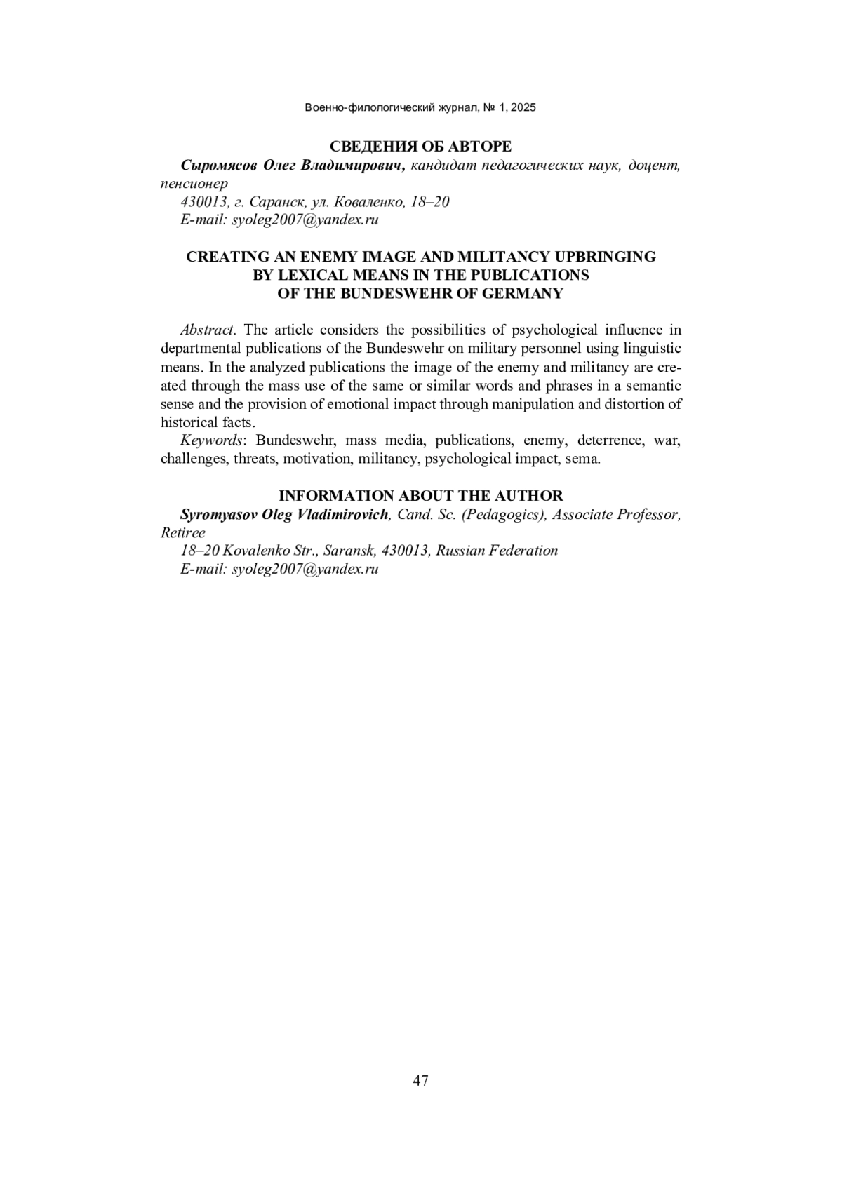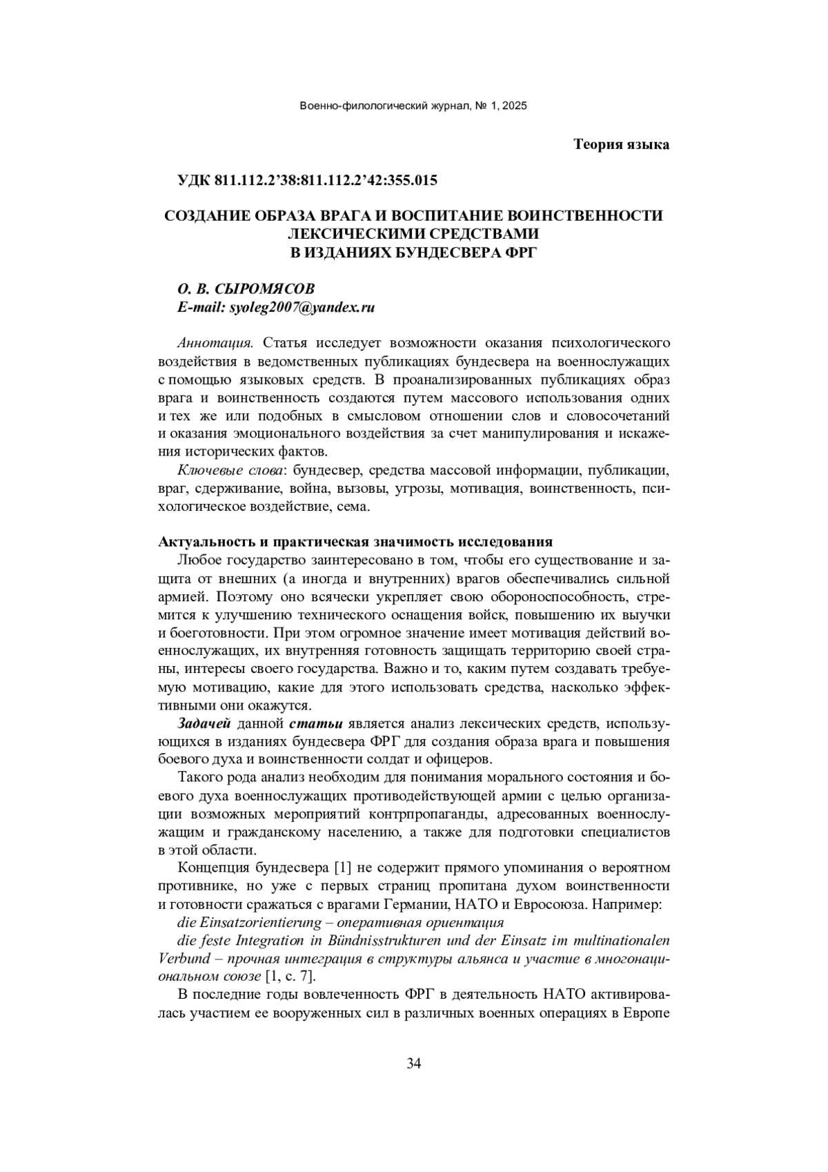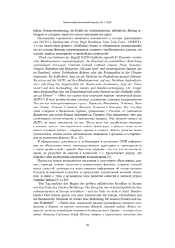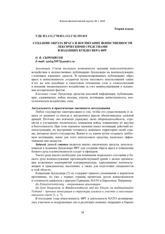 Статья исследует возможности оказания психологического воздействия в ведомственных публикациях бундесвера на военнослужащих с помощью языковых средств. В проанализированных публикациях образ врага и воинственность создаются путем массового использования одних и тех же или подобных в смысловом отношении слов и словосочетаний и оказания эмоционального воздействия за счет манипулирования и искажения исторических фактов.