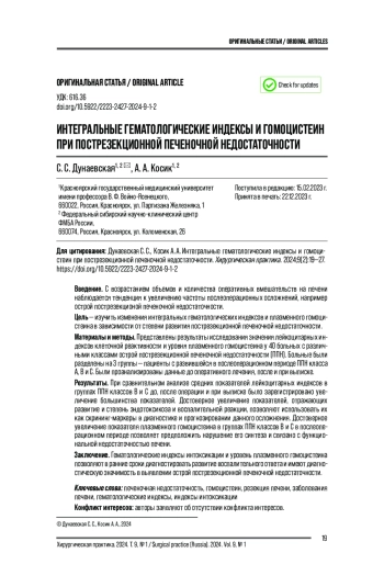 Заключение. Гематологические индексы интоксикации и уровень плазменного гомоцистеина позволяют в ранние сроки диагностировать развитие воспалительного ответа и имеют диагностическую значимость в выявлении острой пострезекционной печеночной недостаточности.