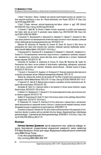 6. Вишневский В. А., Коваленко Ю. А., Андрейцева О. И., Икрамов Р. З., Ефанов М. Г., Назаренко Н. А., Тупикин К. А. Пострезекционная печеночная недостаточность: современные проблемы определения, эпидемиологии, патогенеза, оценки факторов риска, профилактики и лечения. Украинский журнал хирургии. 2013;3(22):172-182.