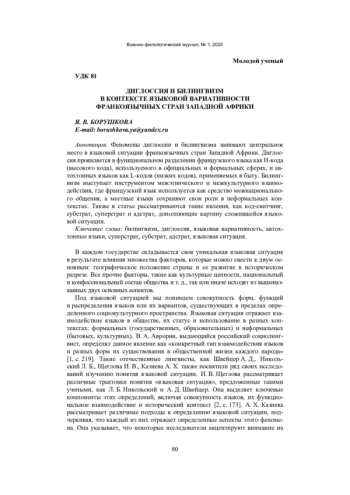 Феномены диглоссии и билингвизма занимают центральное место в языковой ситуации франкоязычных стран Западной Африки. Диглоссия проявляется в функциональном разделении французского языка как H-кода (высокого кода), используемого в официальных и формальных сферах, и автохтонных языков как L-кодов (низких кодов), применяемых в быту. Билингвизм выступает инструментом межэтнического и межкультурного взаимодействия, где французский язык используется как средство межнационального общения, а местные языки сохраняют свои роли в неформальных контекстах. Также в статье рассматриваются такие явления, как код-свитчинг, субстрат, суперстрат и адстрат, дополняющие картину сложившейся языковой ситуации.