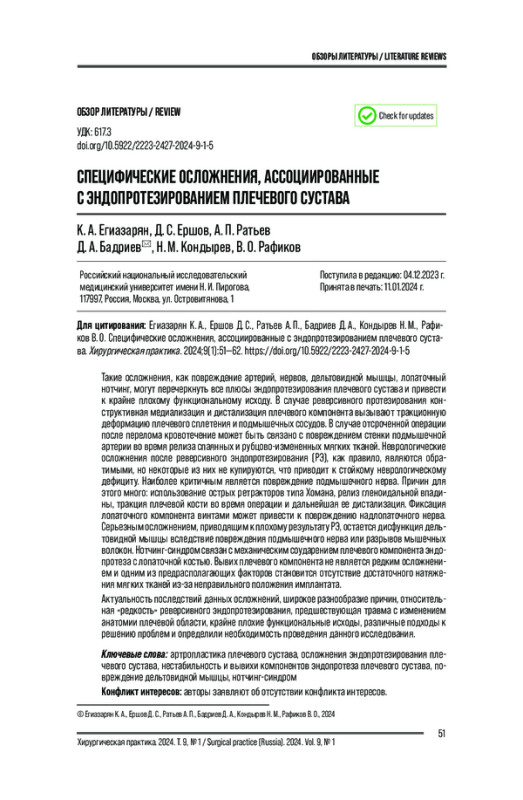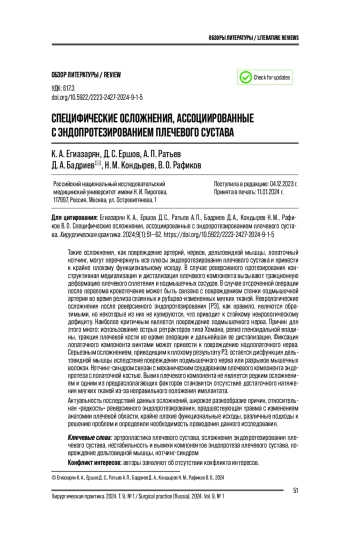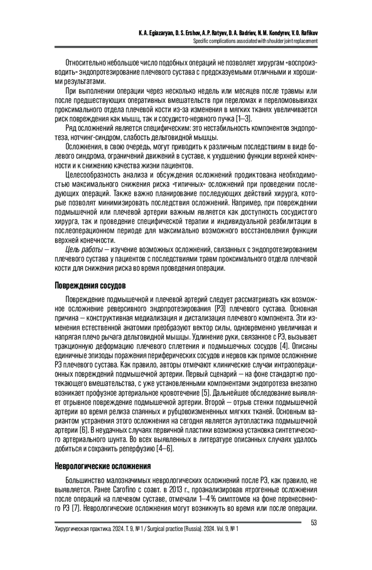 5. Wingert NC, Beck JD, Harter GD. Avulsive axillary artery injury in reverse tоtal shоulder arthrоplasty. Оrthоpedics. 2014;37(1):e92-7. https://dоi.оrg/. DOI: 10.3928/01477447-20131219-24