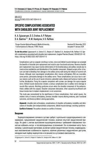 Эндопротезирование плечевого сустава требует тщательного предоперационного планирования, прецизионной хирургической техники, наличия опытной хирургической бригады. Но даже с учетом выполнения вышеперечисленных требований невозможно полностью избежать интра- и послеоперационных осложнений. Эти осложнения могут быть связаны с различными причинами, включая грубую хирургическую технику, индивидуальные анатомические особенности пациента, наличие различных хирургических доступов, некорректный подбор эндопротеза и погрешности в установке компонентов.