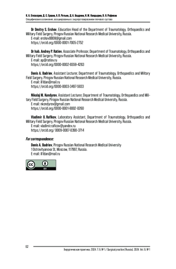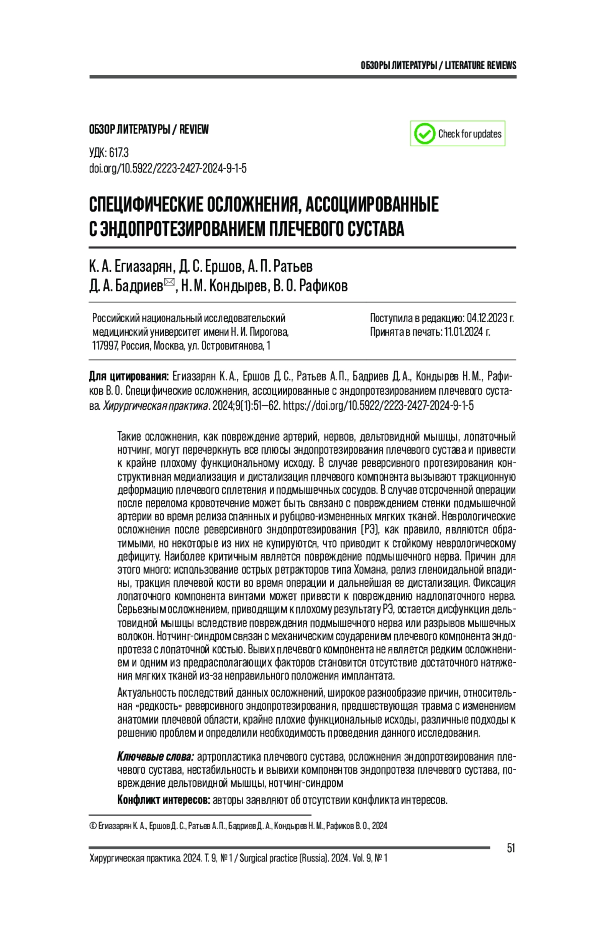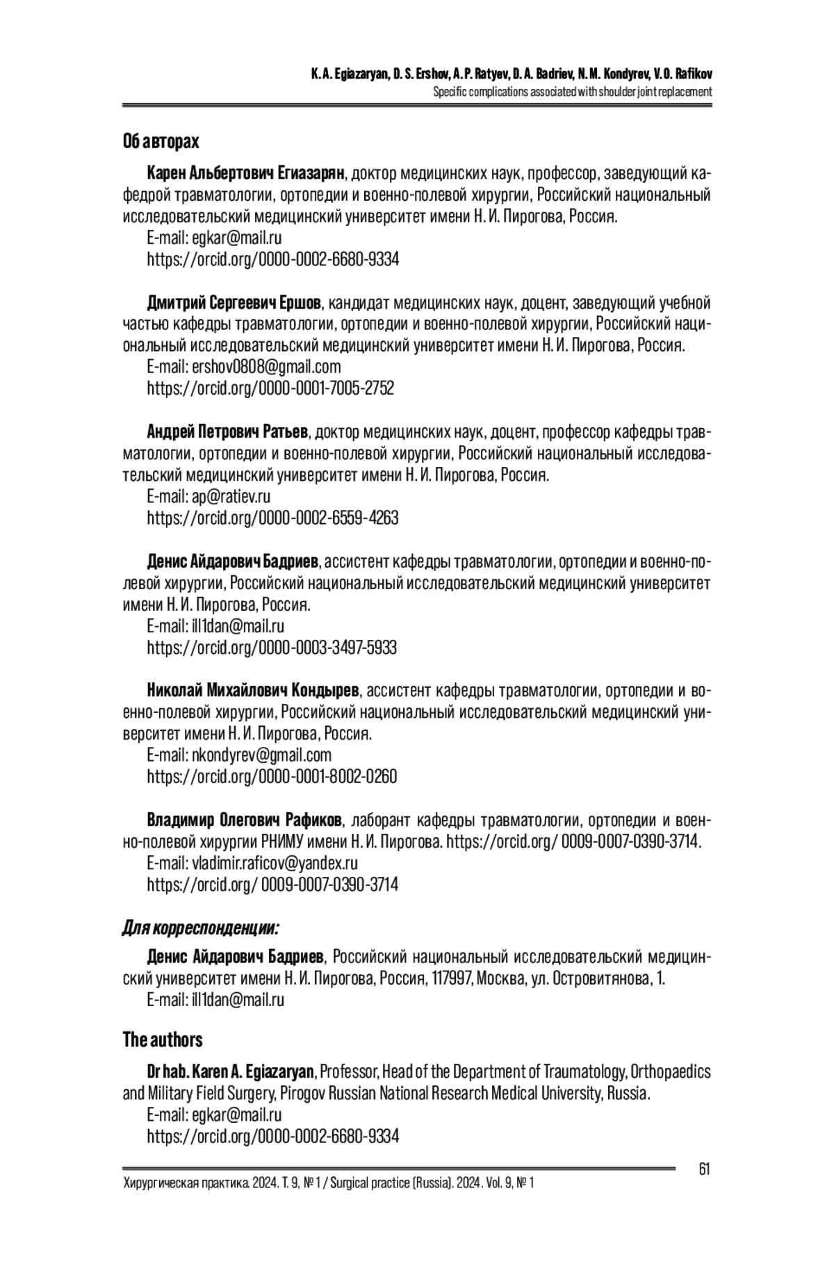 2. Егиазарян К. А., Ратьев А. П., Ершов Д. С., Куруч Е. А., Кузнецов В. Н., Овчаренко Н. В. Среднесрочные результаты хирургического лечения пациентов с переломовывихами плечевой кости. Травматология и ортопедия России. 2020;26(4):68-79.