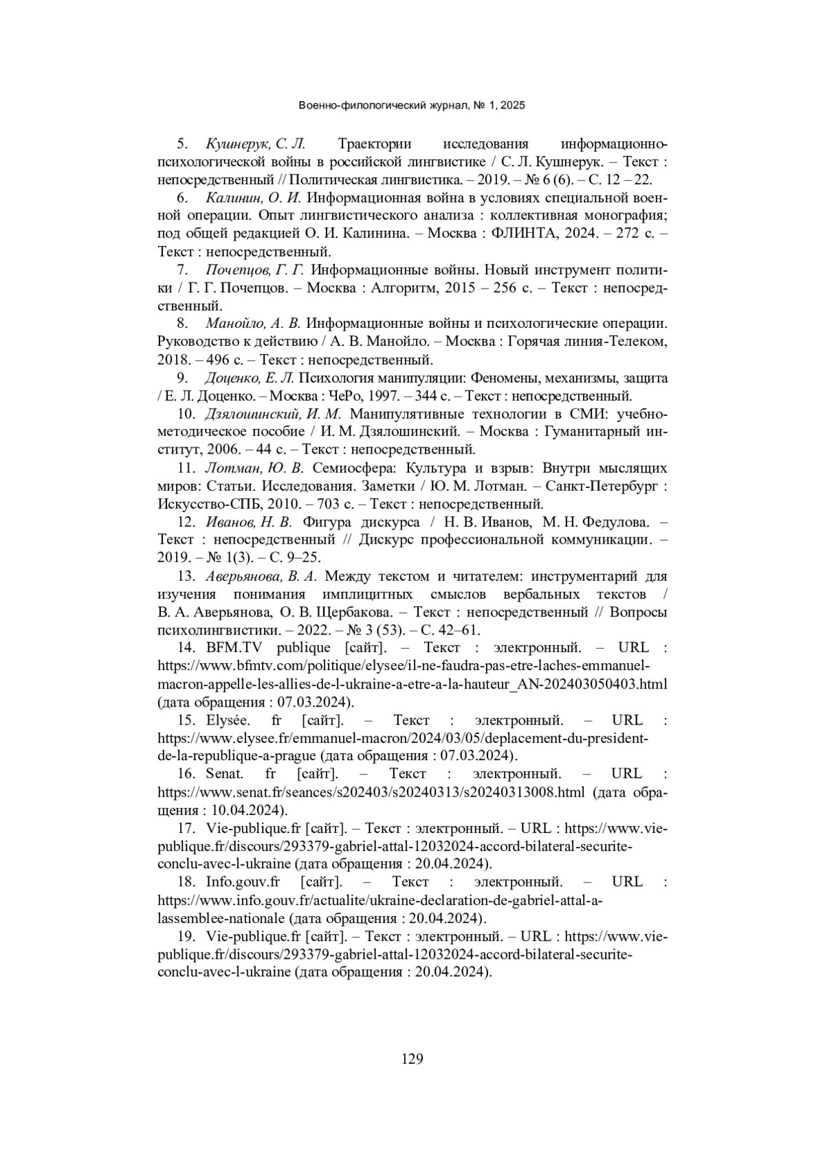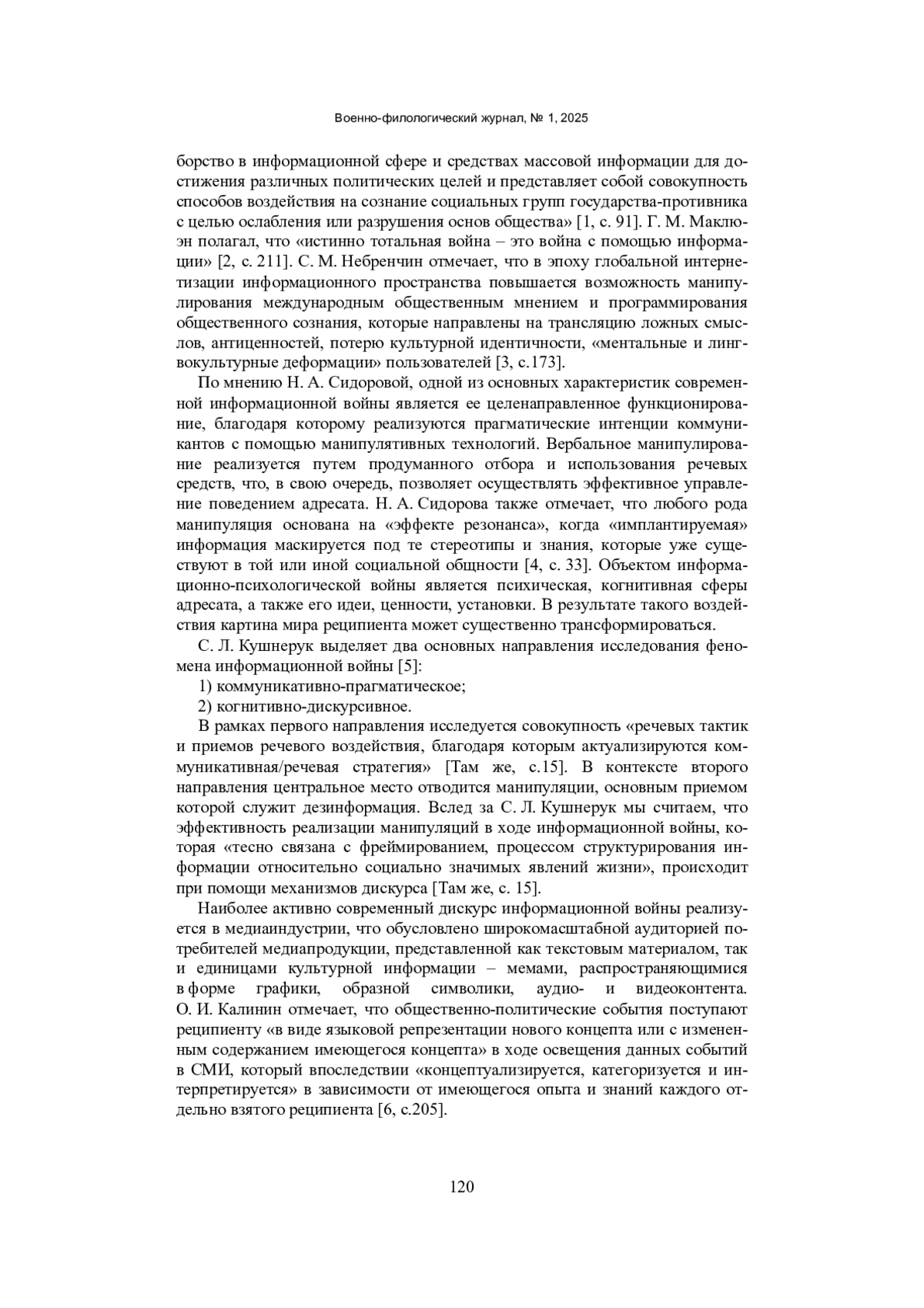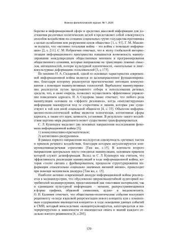 5. Кушнерук, С. Л. Траектории исследования информационно-психологической войны в российской лингвистике / С. Л. Кушнерук. - Текст: непосредственный // Политическая лингвистика. - 2019. - № 6 (6). - С. 12 - 22. EDN: WRAWKY