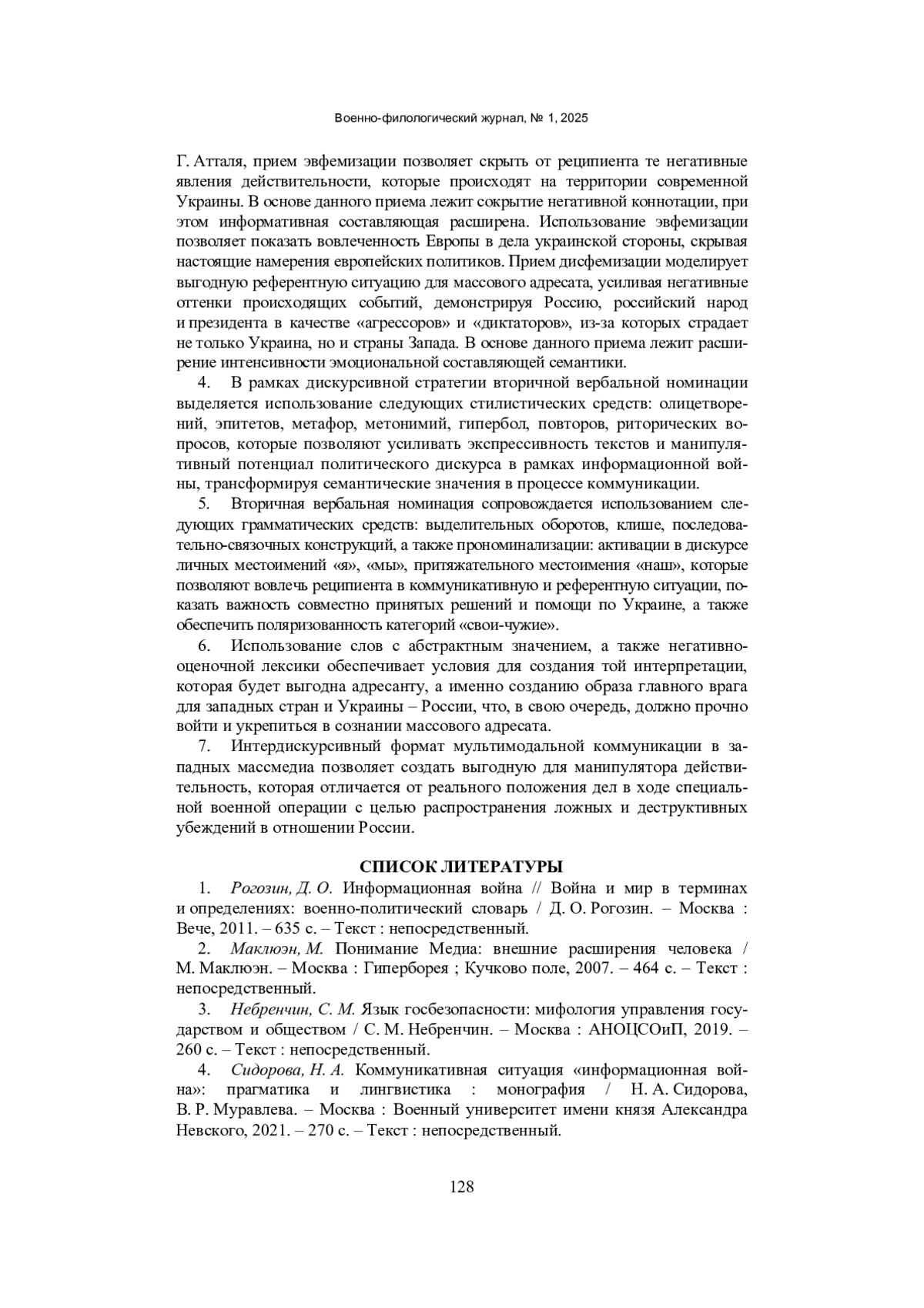 4. Сидорова, Н. А. Коммуникативная ситуация “информационная война”: прагматика и лингвистика: монография / Н. А. Сидорова, В. Р. Муравлева. - Москва: Военный университет имени князя Александра Невского, 2021. - 270 с. - Текст: непосредственный. EDN: KHAADP