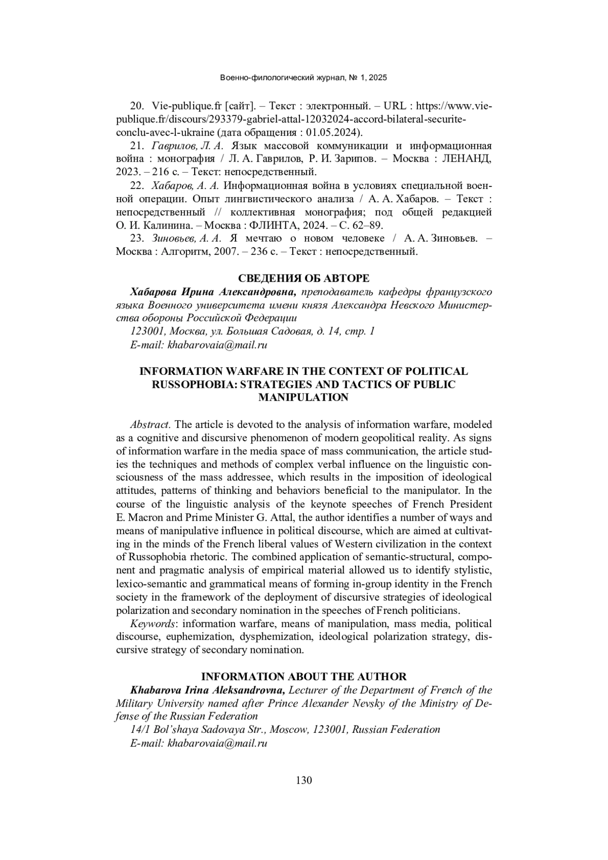 22. Хабаров, А. А. Информационная война как когнитивно-дискурсивный феномен новой геополитической реальности / А. А. Хабаров. - Текст: непосредственный // Информационная война в условиях специальной военной операции. Опыт лингвистического анализа: коллективная монография; под общей редакцией О. И. Калинина. - Москва: ФЛИНТА, 2024. - С. 62-88. EDN: LKCJPM