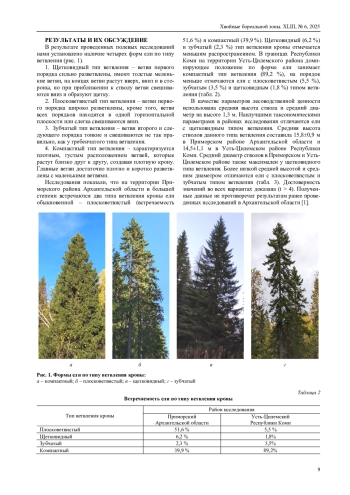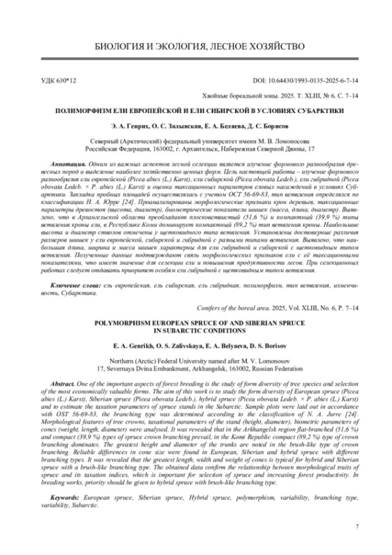 Одним из важных аспектов лесной селекции является изучение формового разнообразия древесных пород и выделение наиболее хозяйственно ценных форм. Цель настоящей работы – изучение формового разнообразия ели европейской (Picea abies (L.) Karst), ели сибирской (Picea obovata Ledeb.), ели гибридной (Picea obovata Ledeb. × P. abies (L.) Karst) и оценка таксационных параметров еловых насаждений в условиях Субарктики. Закладка пробных площадей осуществлялась с учетом ОСТ 56-69-83, тип ветвления определялся по классификации Н. А. Юрре [24]. Проанализированы морфологические признаки крон деревьев, таксационные параметры древостоя (высота, диаметр), биометрические показатели шишек (масса, длина, диаметр). Выявлено, что в Архангельской области преобладают плосковетвистый (51,6 %) и компактный (39,9 %) типы ветвления кроны ели, в Республике Коми доминирует компактный (89,2 %) тип ветвления кроны. Наибольшие высота и диаметр стволов отмечены у щетковидного типа ветвления. Установлены достоверные различия размеров шишек у ели европейской, сибирской и гибридной с разными типами ветвления. Выявлено, что наибольшая длина, ширина и масса шишек характерны для ели гибридной и сибирской с щетковидным типом ветвления. Полученные данные подтверждают связь морфологических признаков ели с её таксационными показателями, что имеет значение для селекции ели и повышения продуктивности лесов. При селекционных работах следует отдавать приоритет особям ели гибридной с щетковидным типом ветвления.