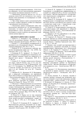 11. Попов П. П. Казанцева М. Н., Арефьев С. П. Фенотипическая структура популяций ели на Европейском Севере России // Известия высших учебных заведений. Лесной журнал. 2021. № 2(380). С. 9-20.