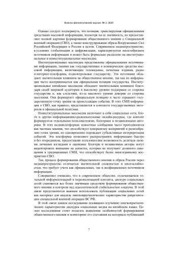Данная статья посвящена критическому дискурс-анализу институциональных СМИ Китая в контексте репрезентации специальной военной операции (СВО). Исследование фокусируется на изучении лингвопрагматических характеристик дискурса социальных медиа (платформы Weibo и Zhihu). Рассматриваются механизмы информационного воздействия и роль социальных медиа в конструировании политического и идеологического дискурса. Особое внимание уделяется анализу ключевых слов, их коллокаций и тональности, что позволяет выявить особенности формирования общественного мнения об СВО в китайских социальных сетях. Основные выводы показывают, что репрезентация России в китайских социальных сетях преимущественно негативная, при этом акцент падает на гуманитарные и экономические последствия конфликта.