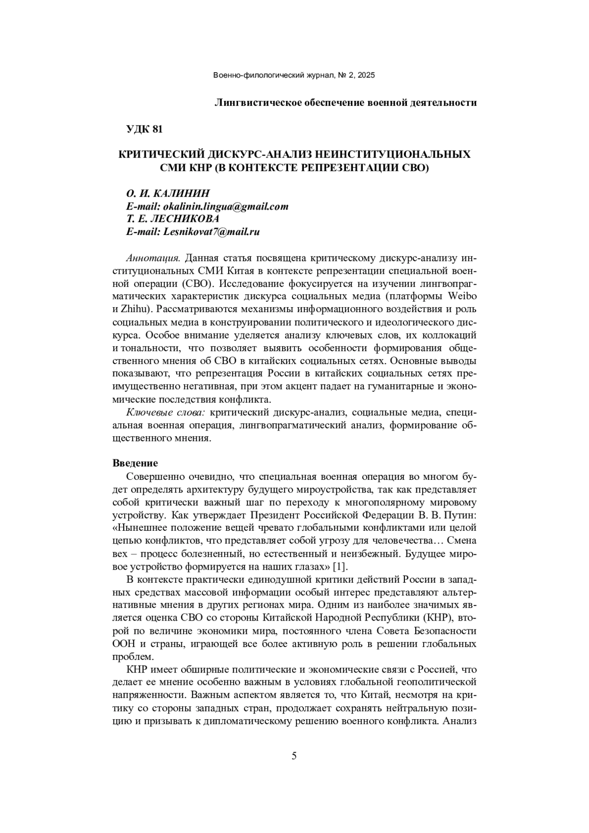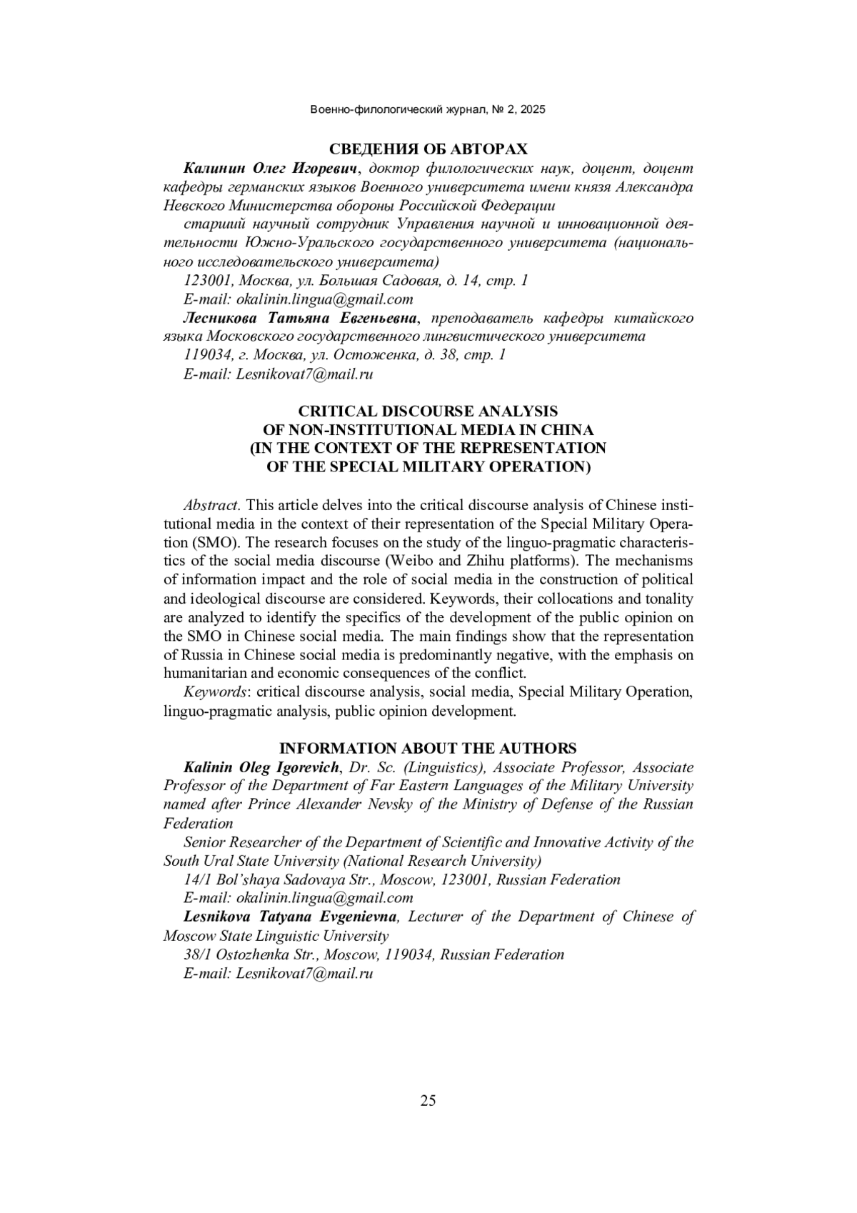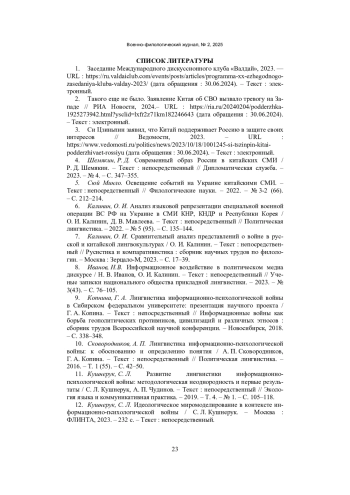 17. Калинин, О. И. Корпусный анализ языковой репрезентации специальной военной операции ВС РФ на Украине в СМИ КНР / О. И. Калинин. - Текст: непосредственный // Вестник Московского государственного лингвистического университета. Гуманитарные науки. - 2022. - № 10(865). - С. 41-47. EDN: GVIHES