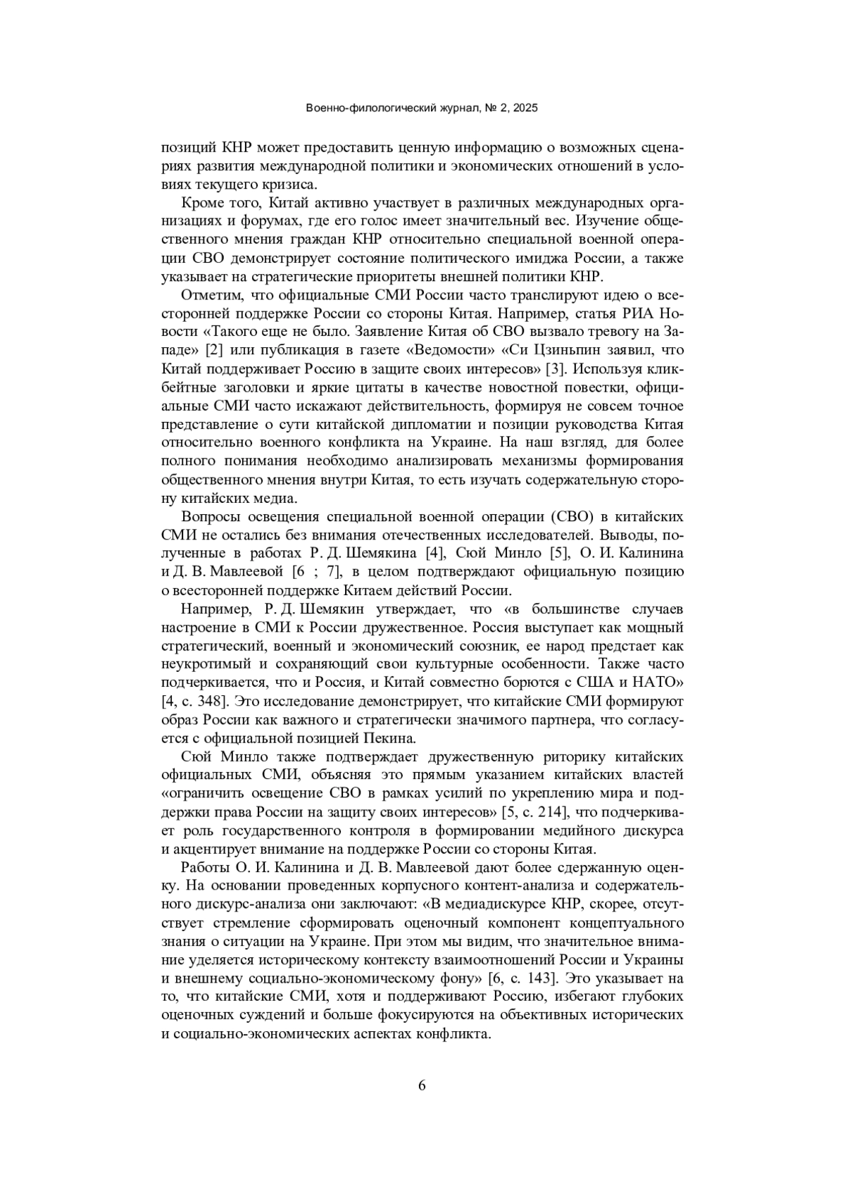 6. Калинин, О. И. Анализ языковой репрезентации специальной военной операции ВС РФ на Украине в СМИ КНР, КНДР и Республики Корея / О. И. Калинин, Д. В. Мавлеева. - Текст: непосредственный // Политическая лингвистика. - 2022. - № 5 (95). - С. 135-144. EDN: HAXBQW