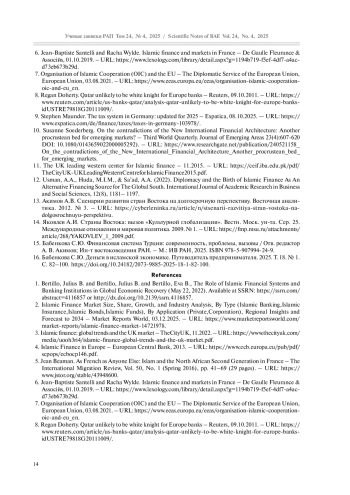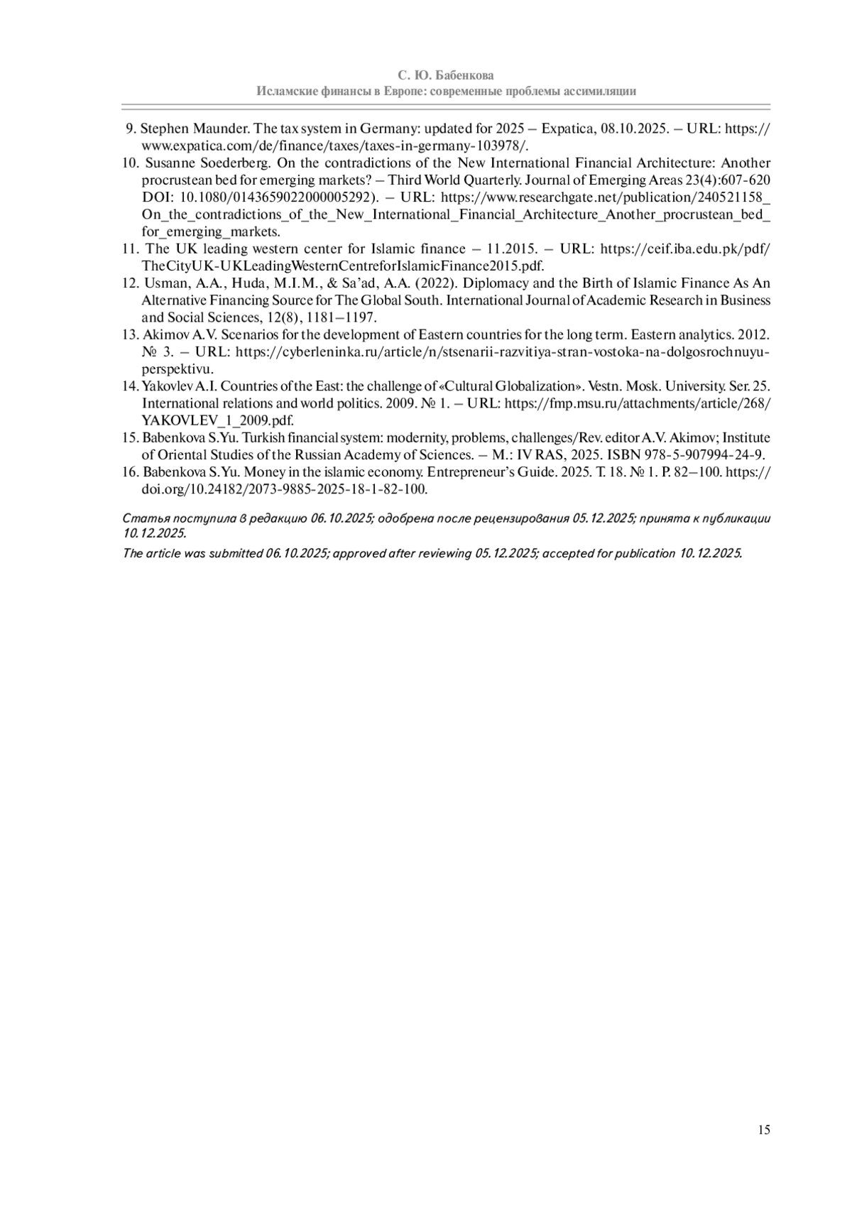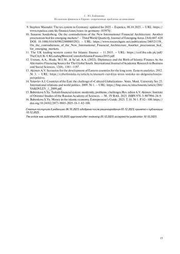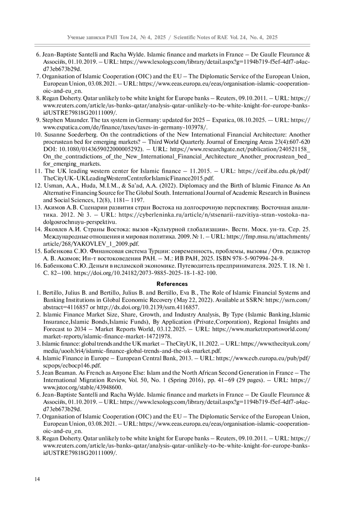 16. Бабенкова С.Ю. Деньги в исламской экономике. Путеводитель предпринимателя. 2025. Т. 18. № 1. С. 82-100. https://doi.org/10.24182/2073-9885-2025-18-1-82-100.