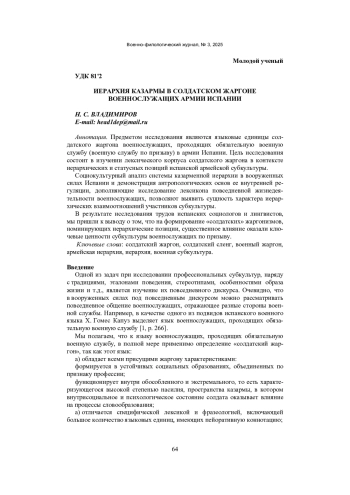 Социокультурный анализ системы казарменной иерархии в вооруженных силах Испании и демонстрация антропологических основ ее внутренней регуляции, дополняющие исследование лексикона повседневной жизнедеятельности военнослужащих, позволяют выявить сущность характера иерархических взаимоотношений участников субкультуры.