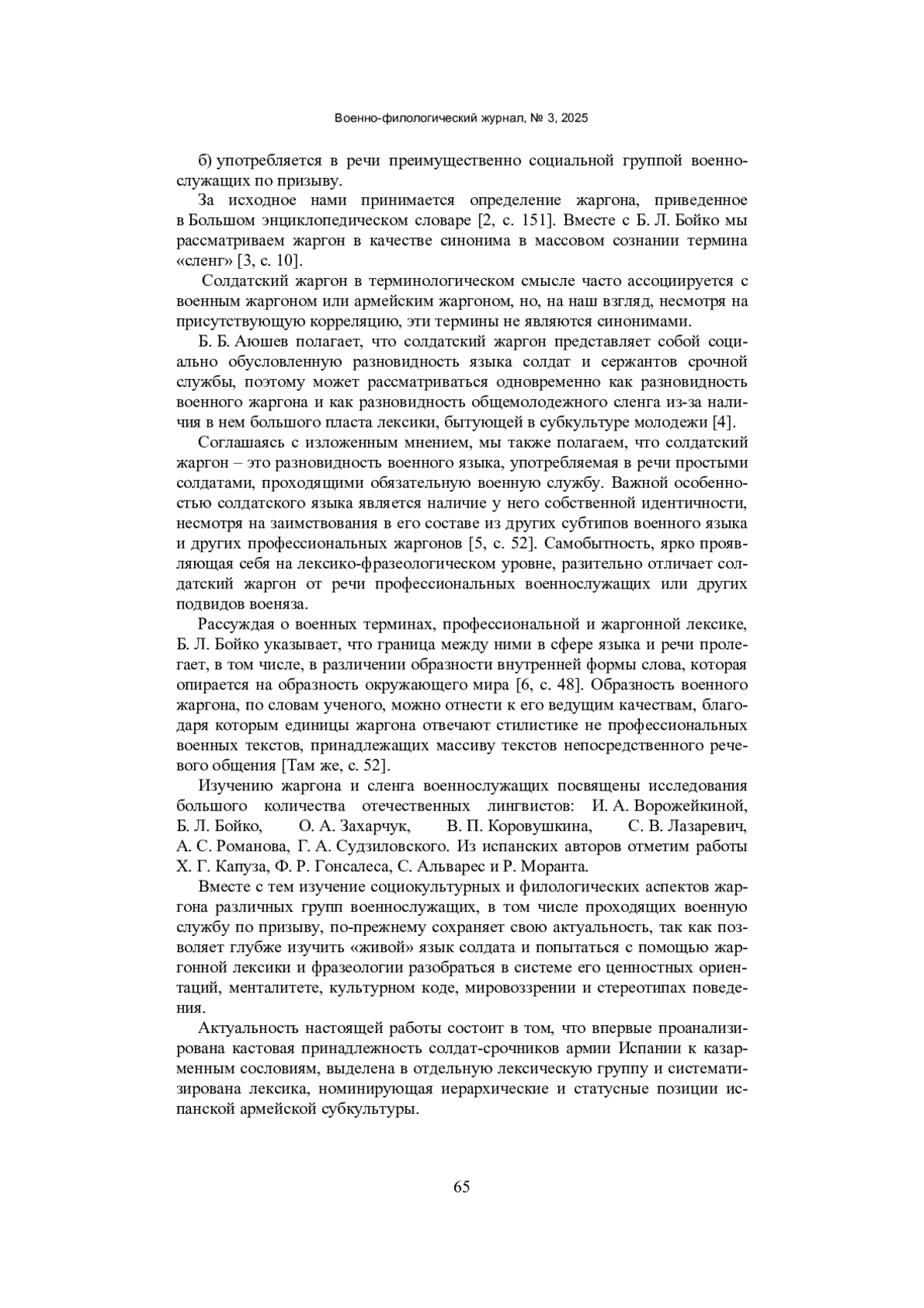 7. Бойко, Б. Л. Военный жаргон в армейских субкультурах (на материале русского и немецкого языков) / Б. Л. Бойко. - Текст: электронный // Известия ВГПУ. - 2008. - № 10. - URL: https://cyberleninka.ru/article/n/voennyy-zhargon-v-armeyskih-subculturah-na-materiale-russkogo-i-nemetskogo-yazykov (дата обращения: 25.04.2025).