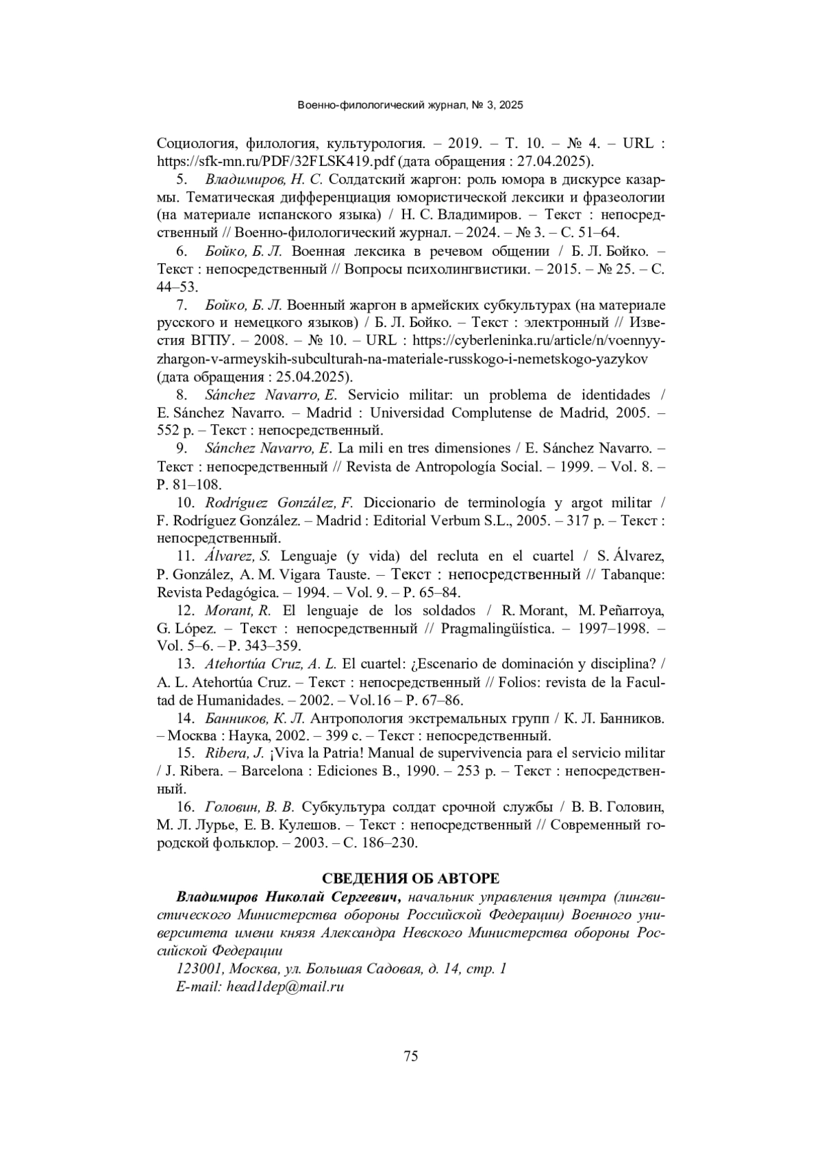 5. Владимиров, Н. С. Солдатский жаргон: роль юмора в дискурсе казармы. Тематическая дифференциация юмористической лексики и фразеологии (на материале испанского языка) / Н. С. Владимиров. - Текст: непосредственный // Военно-филологический журнал. - 2024. - № 3. - С. 51-64. EDN: ZDUUWA