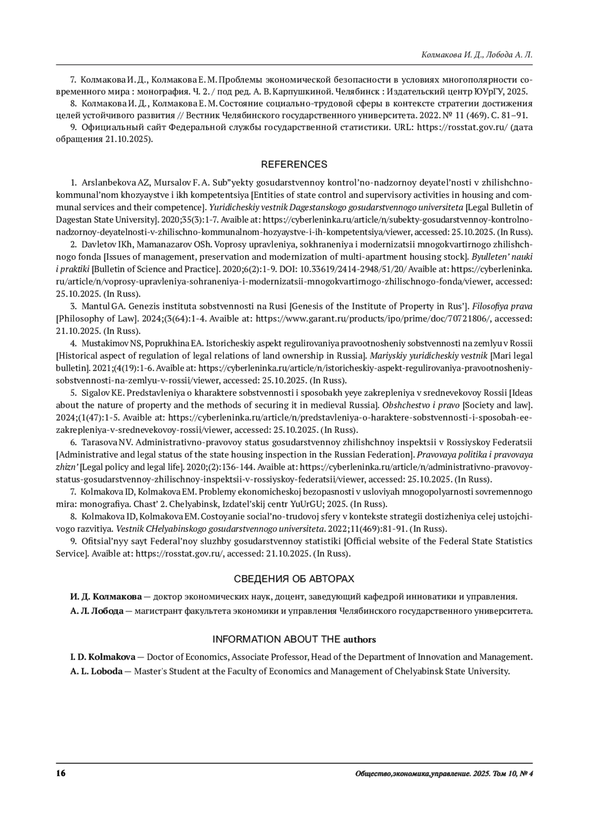 7. Колмакова И. Д., Колмакова Е. М. Проблемы экономической безопасности в условиях многополярности современного мира: монография. Ч. 2. / под ред. А. В. Карпушкиной. Челябинск: Издательский центр ЮУрГУ, 2025.